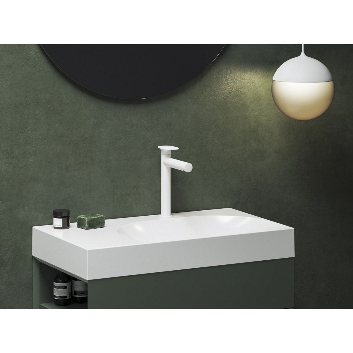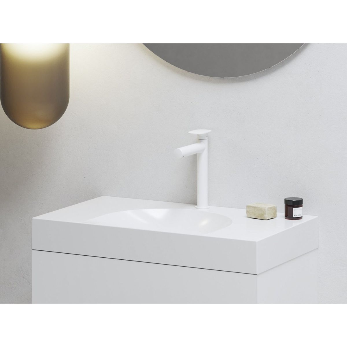 Standwaschtischarmatur Spring, ohne Stopfen. Ausführung in mattem Weiß. Verdeckter Strahlregler mit EcoFlow-Funktion.
