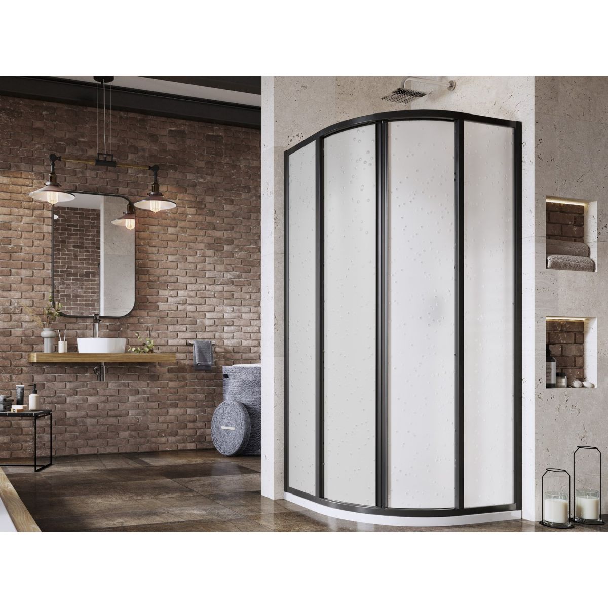 Vierteilige halbrunde Duschkabine Supernova in schwarzer Ausführung mit Kunststofffüllung und Pearl-Dekor. Schiebeöffnungssystem.