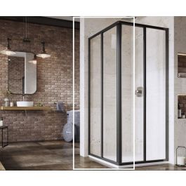 1/2 Eckduschkabine Supernova in schwarzer Ausführung mit transparenter Glasfüllung und Ravak AntiCalc®-Schutzschicht. Schiebeöffnungssystem.