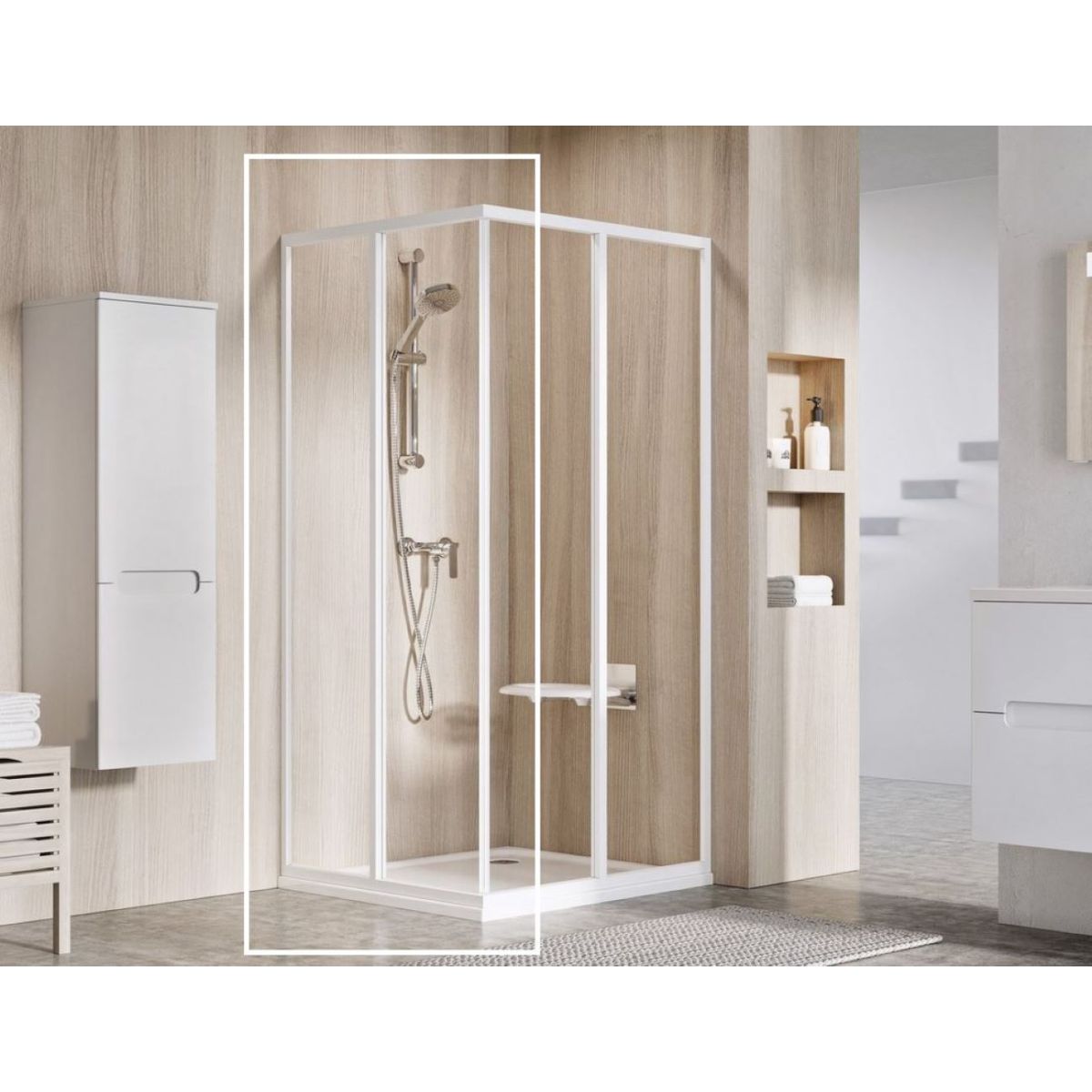 1/2 Eckduschkabine Supernova in Weiß mit transparenter Glasfüllung und Ravak AntiCalc®-Schutzbeschichtung. Schiebeöffnungssystem.