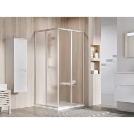 Die komplette Eckdusche besteht aus zwei Schiebetüren, die separat erworben werden müssen. Montage in einer gefliesten Ecke des Badezimmers direkt auf dem Boden mit eingebautem Linienablauf oder Ablaufrost. Mit dem Verbreiterungsprofil NPS können die Produkte um 20 mm verbreitert werden, sodass sie sich perfekt an Unebenheiten von bis zu 4 cm auf jeder Seite anpassen.