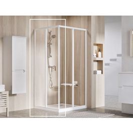 1/2 Eckduschkabine Supernova in Weiß mit transparenter Glasfüllung und Ravak AntiCalc®-Schutzbeschichtung. Schiebeöffnungssystem.