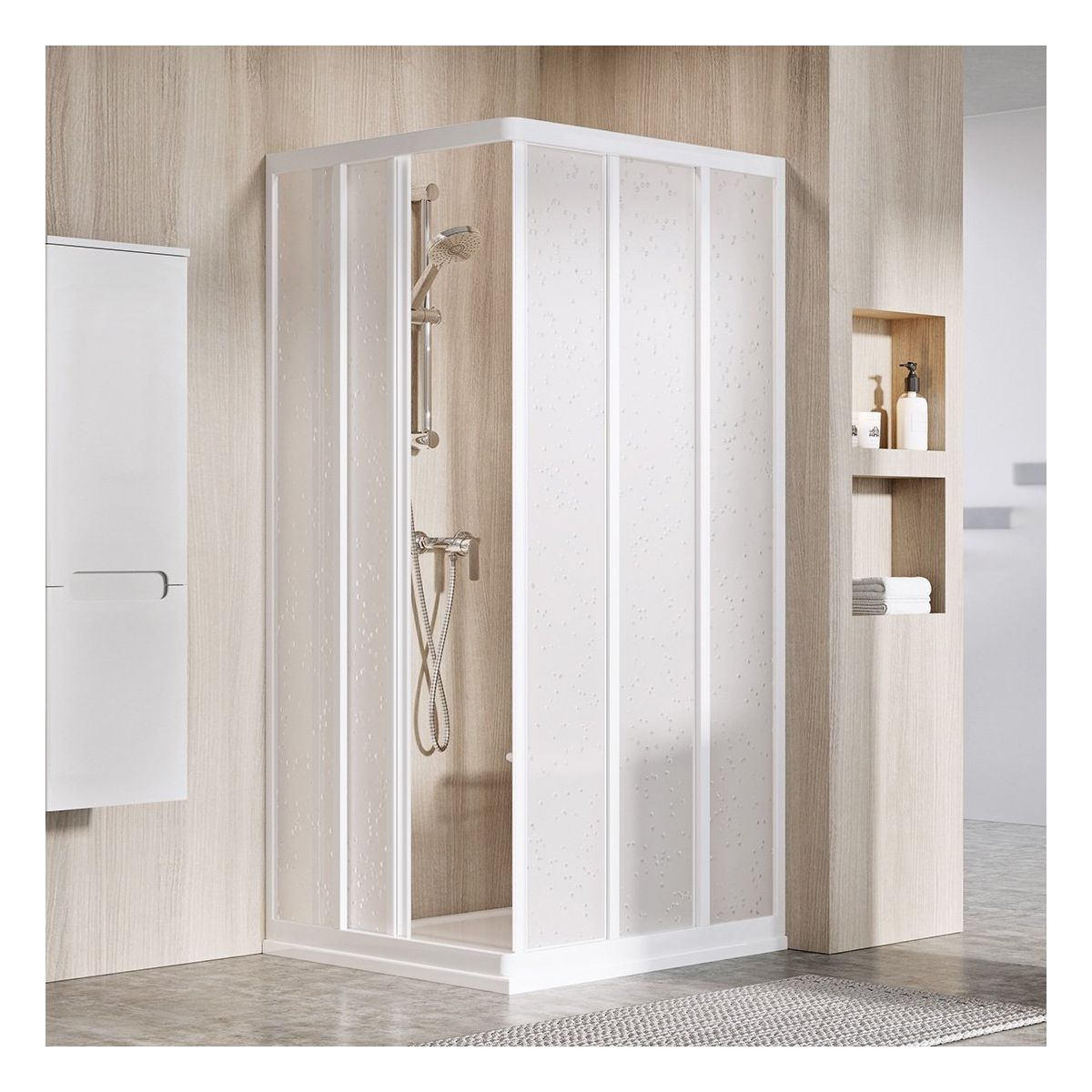 Ein Produkt bildet die Hälfte der Duschkabine. Um eine Eckduschkabine zu erstellen, werden zwei Stück Schiebetüren ASRV3 benötigt.