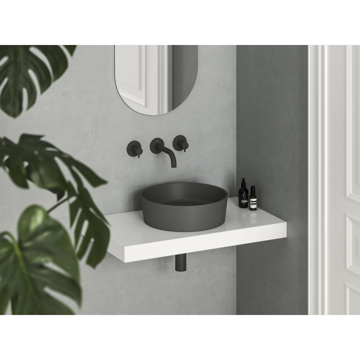 Das dünnwandige Keramikwaschbecken Uni Slim ist für die Montage auf einer Arbeitsplatte oder einem Schrank ohne Überlauf vorgesehen. Farbe: Anthrazit.