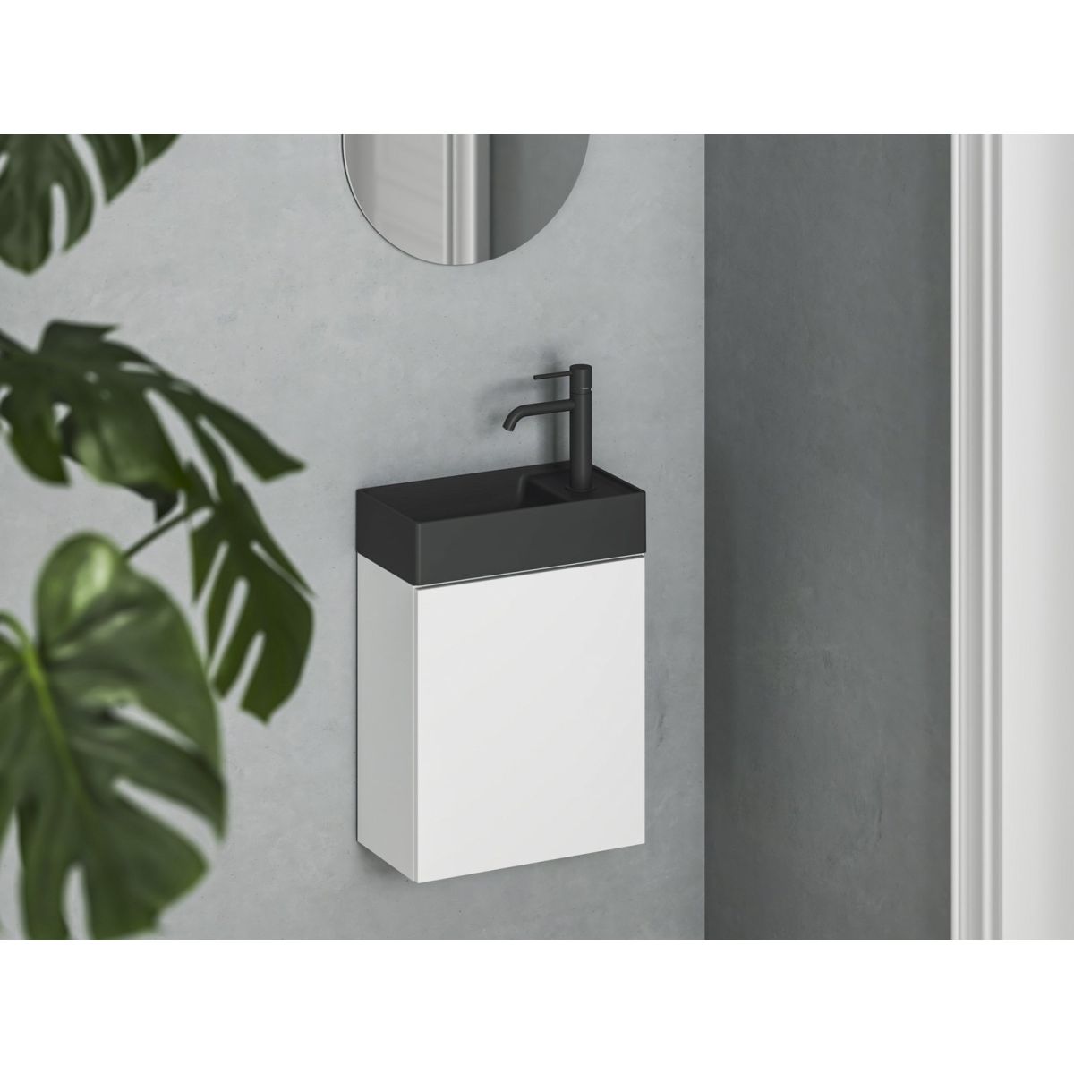 Das dünnwandige Keramikwaschbecken Veda Slim ist für die Montage mit einem speziellen Hängeschrank ohne Überlauf vorgesehen. Farbe: Mattschwarz.