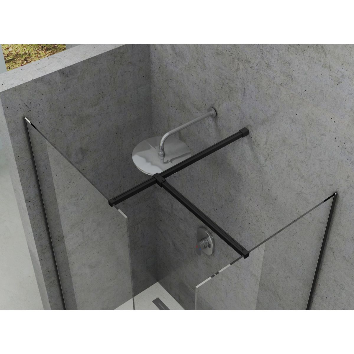 Metallverbinder in schwarzer Ausführung. Dient zur Verbindung der Halterungen in der Walk-In Double Wall-Duschkabine. Die Halterung stützt die Seitenfläche der Walk-In Double Wall-Kabine und sorgt für die Stabilität der gesamten Kabine. Die Halterung ist 120 cm lang und kann gekürzt werden. Im Uni T-Set bestimmt sie die Breite des Kabineneingangs.