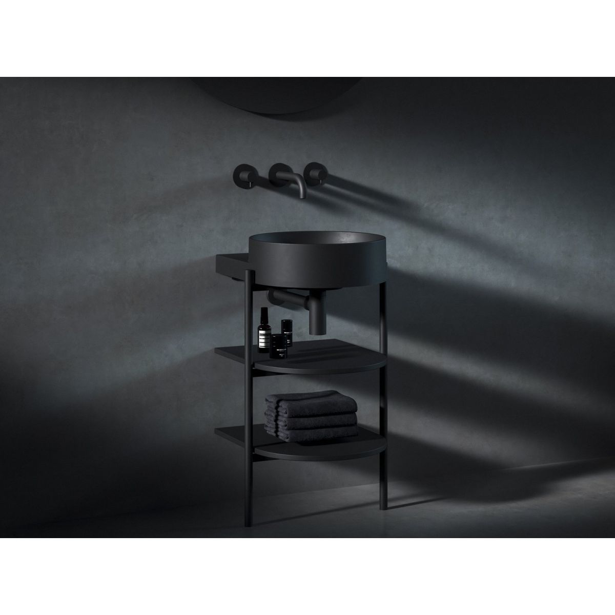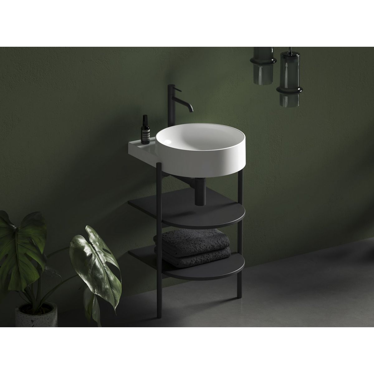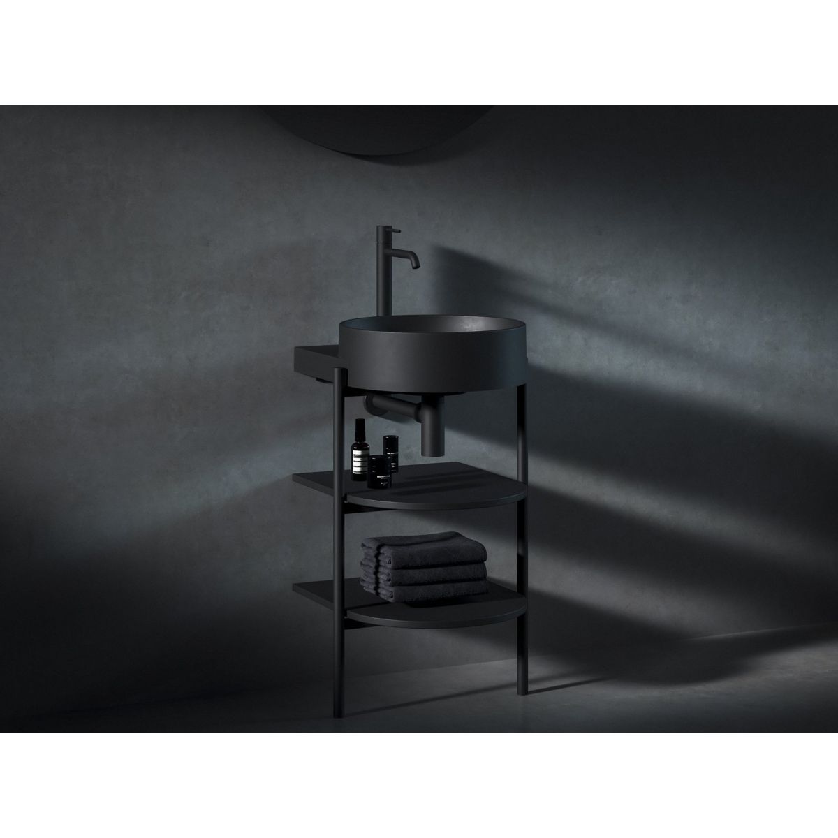 Stehende Metallkonstruktion mit Regalen CS Yard 40 zur Montage des Waschbeckens Yard 40. In mattschwarzer Ausführung.