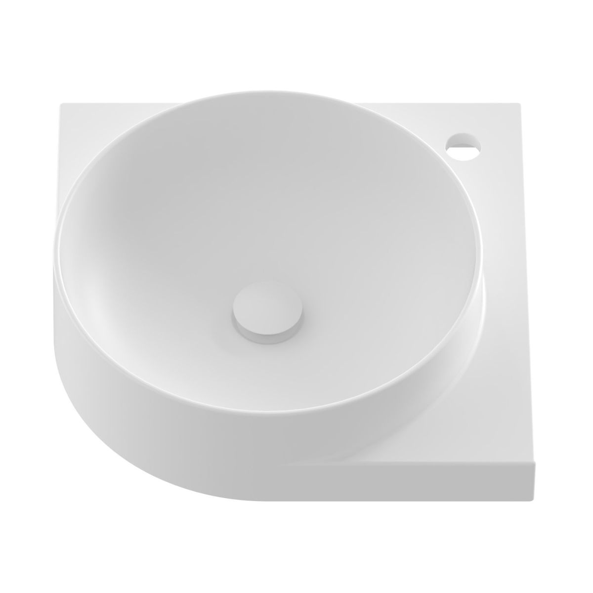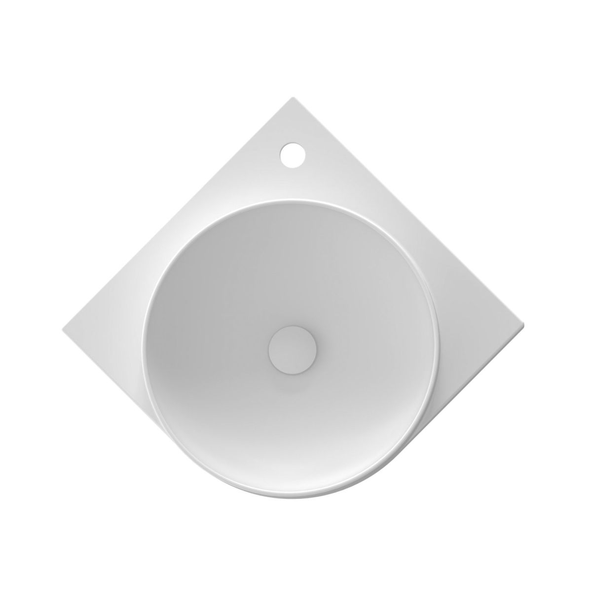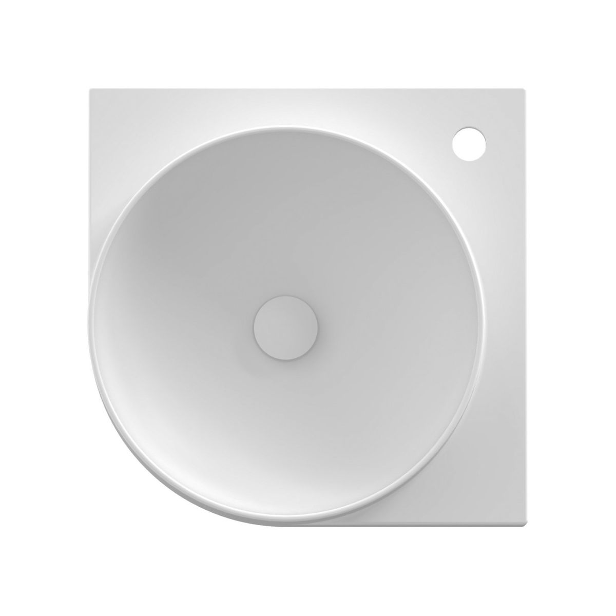 Das dünnwandige Eckwaschbecken Yard ist für die Montage auf der Yard-Konsole oder auf einer Arbeitsplatte ohne Überlauf vorgesehen. Farbe: mattweiß. Mit Öffnung für Wasserhahn.