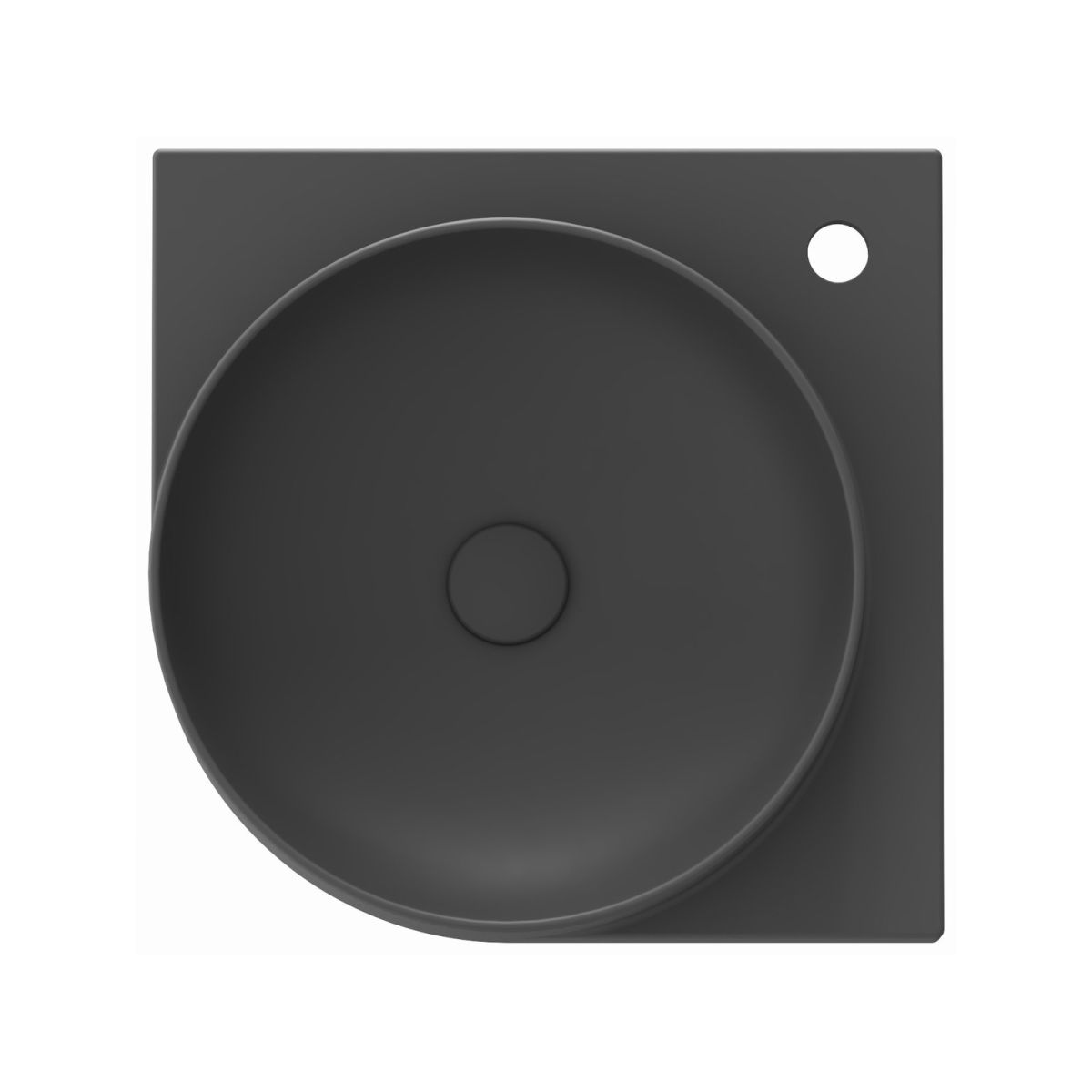 Das dünnwandige Eckwaschbecken Yard ist für die Montage auf der Yard-Konsole oder auf einer Arbeitsplatte ohne Überlauf vorgesehen. Farbe: Anthrazit. Mit Loch für Wasserhahn.