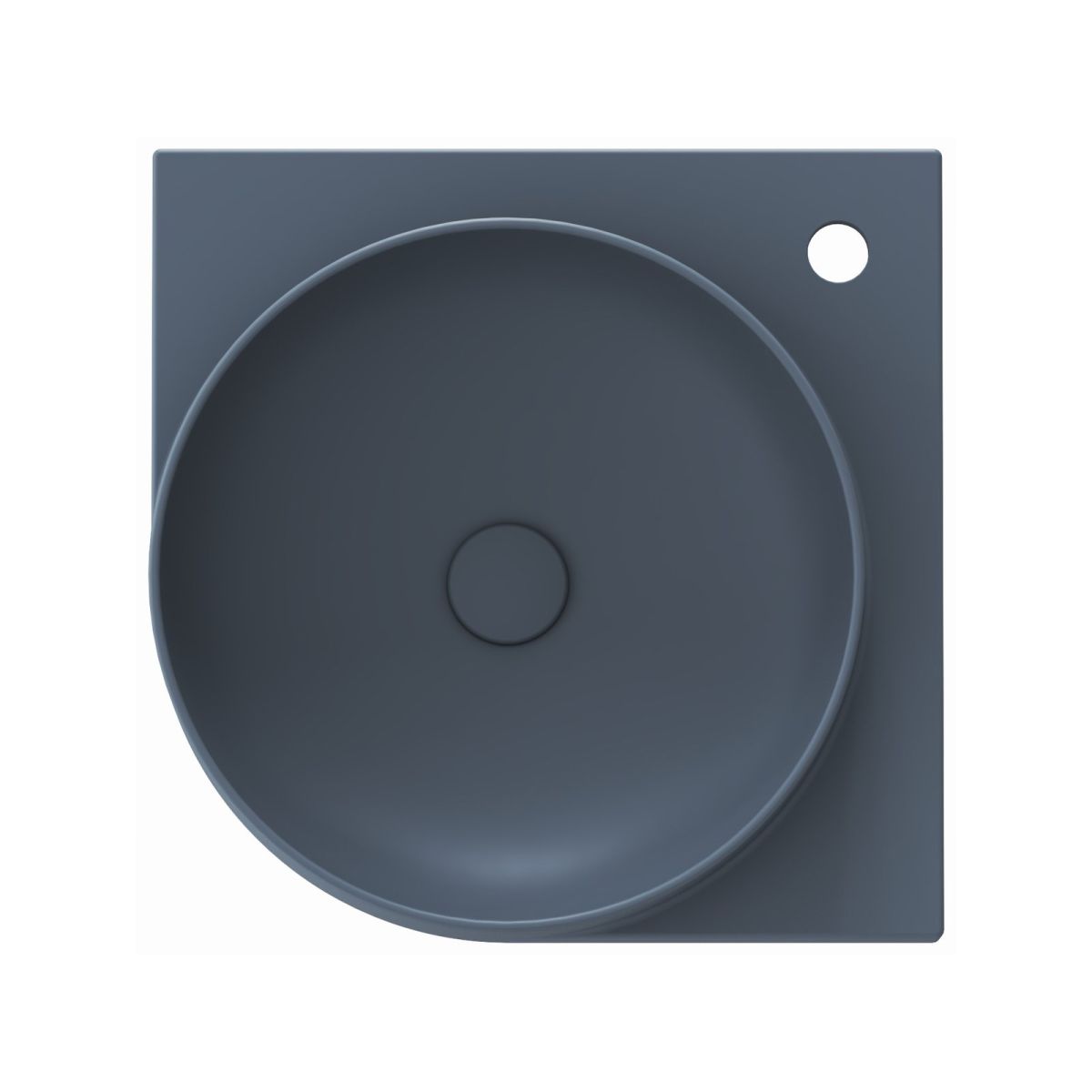Das dünnwandige Eckwaschbecken Yard ist für die Montage auf der Yard-Konsole oder auf einer Arbeitsplatte ohne Überlauf vorgesehen. Farbe Deepsea Blue. Mit Loch für Wasserhahn.