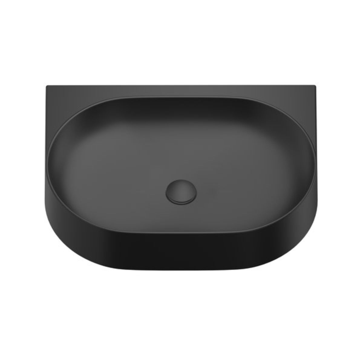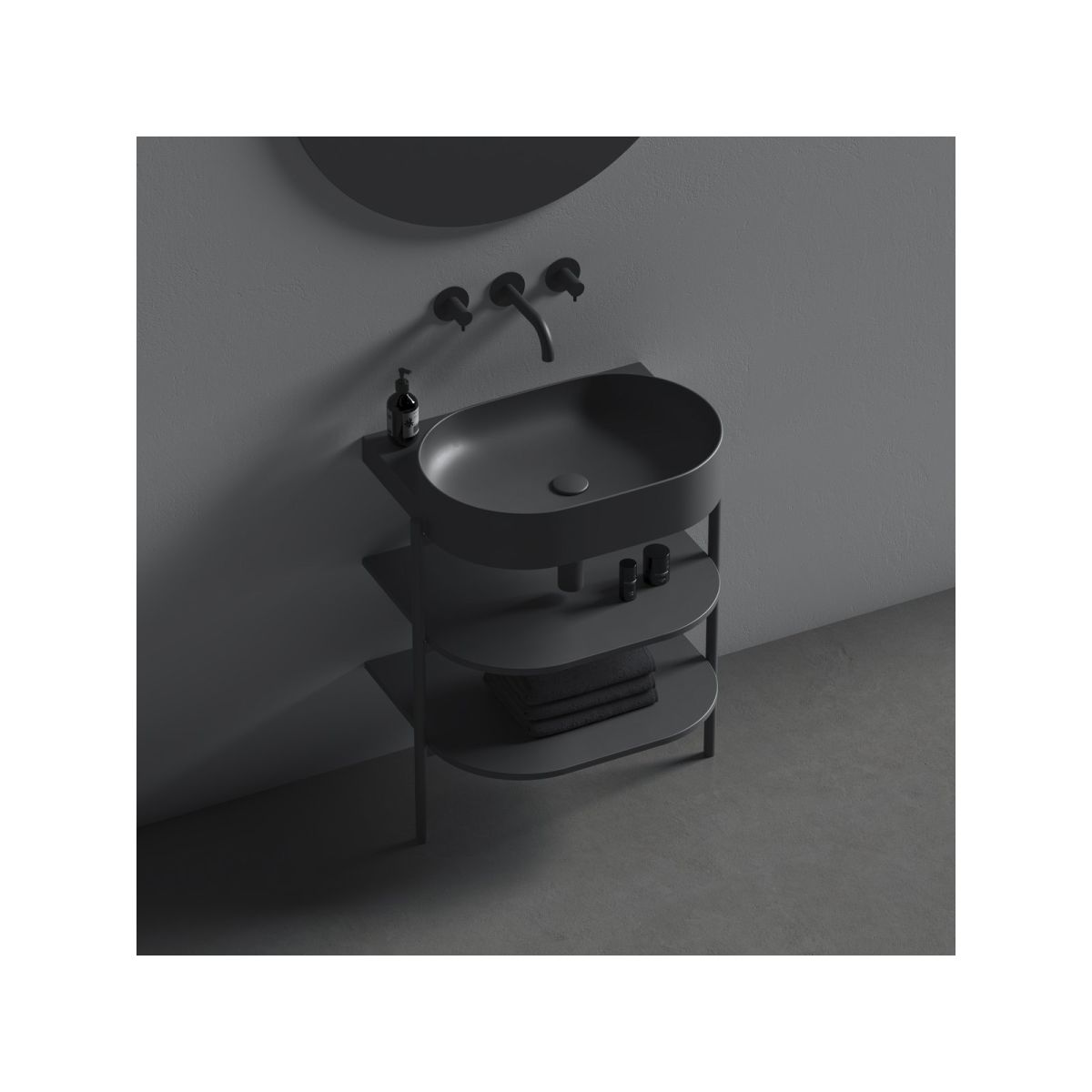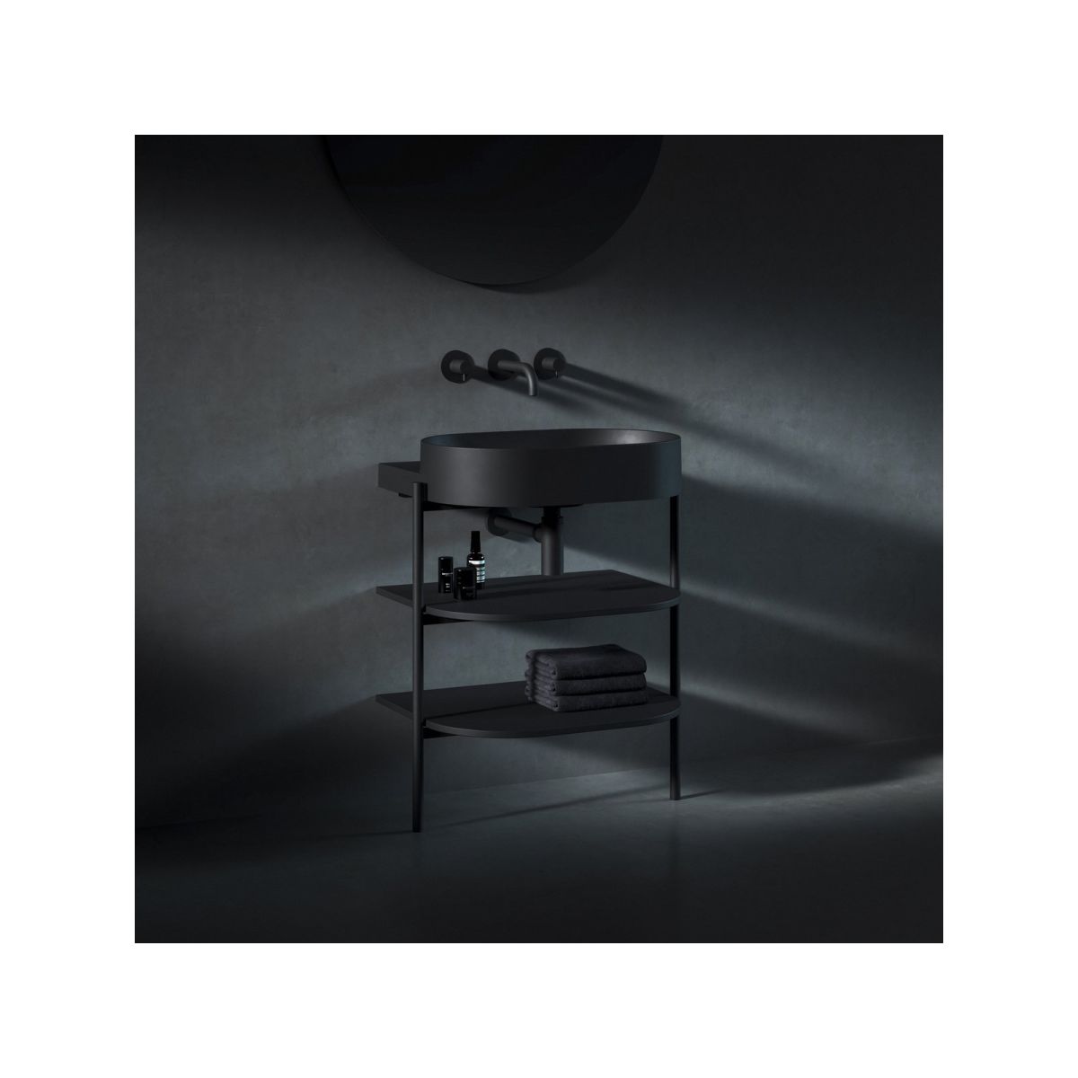 Das dünnwandige Keramikwaschbecken Yard ist für die Montage auf der Yard-Konsole oder auf einer Arbeitsplatte ohne Überlauf vorgesehen. Farbe: Mattschwarz. Ohne Loch – zum Anschluss an eine Unterputz-Waschtischarmatur.