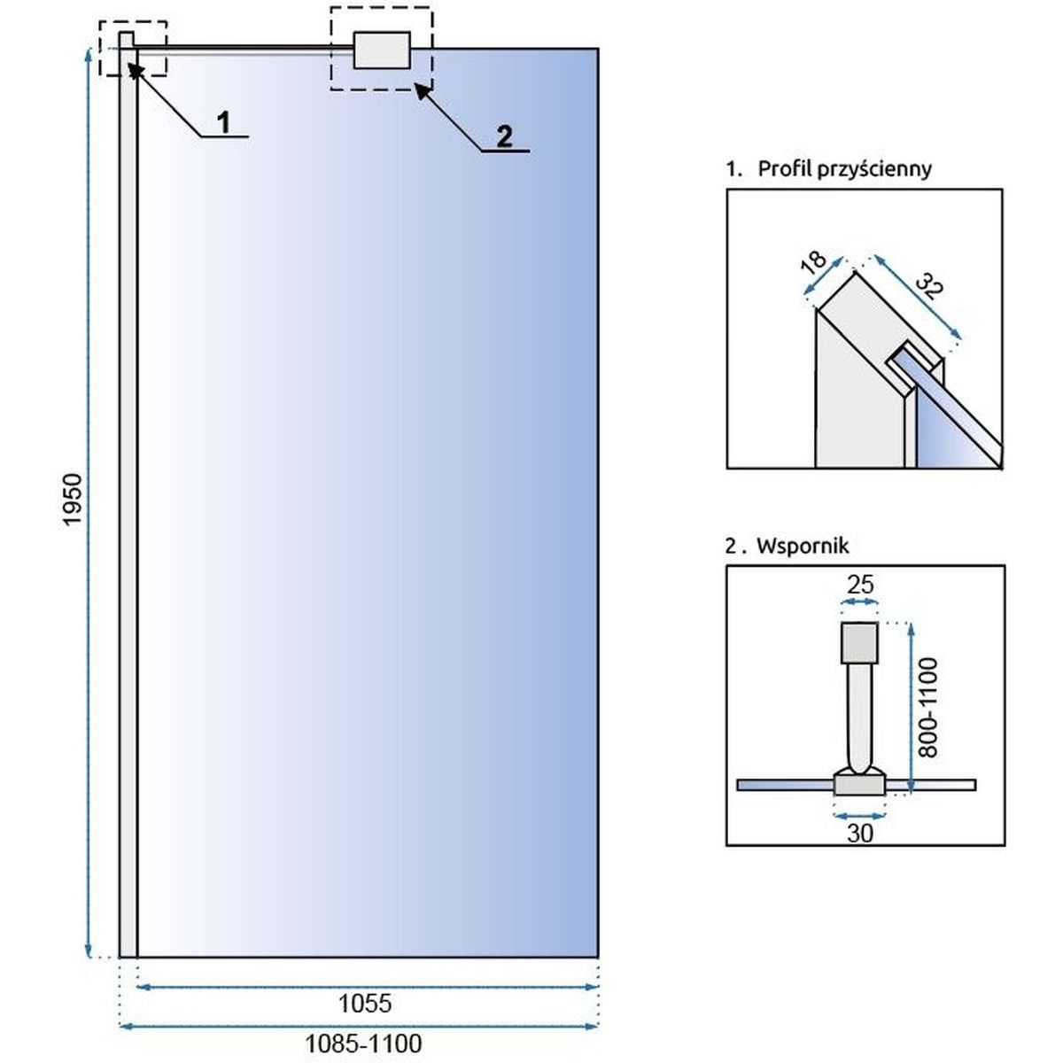 - Breite der festen Wand: 105,5 cm