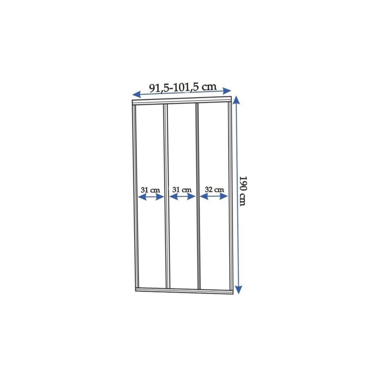 - Tür: im Rahmen, 3-teilig, ein festes Element, zwei Schiebeelemente/ oben Laufrollen, unten Schieber