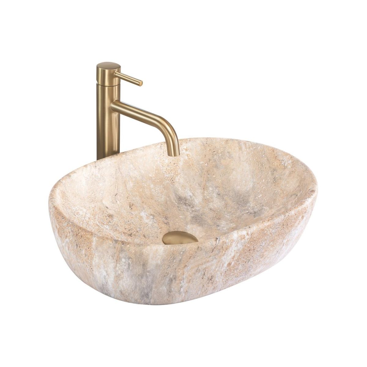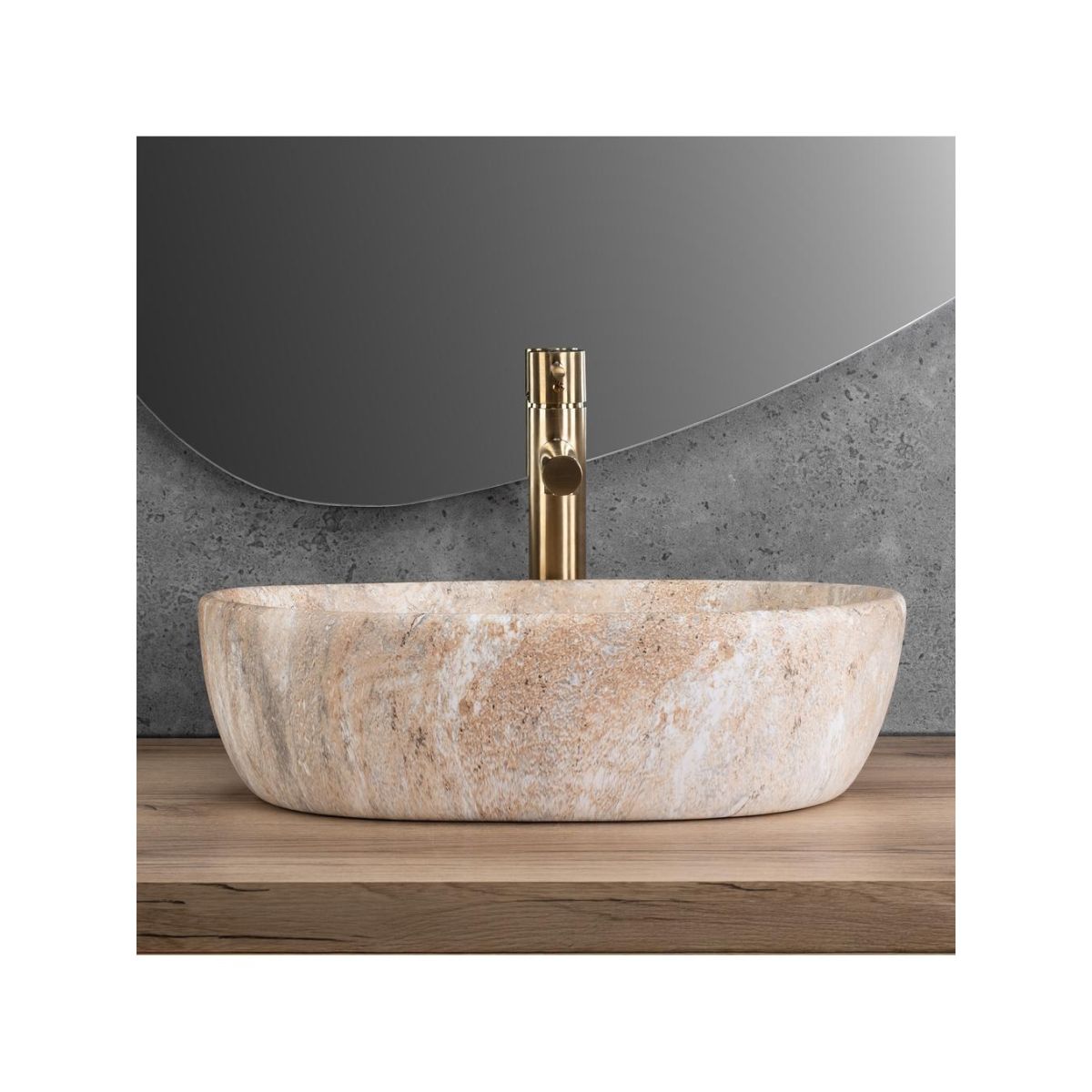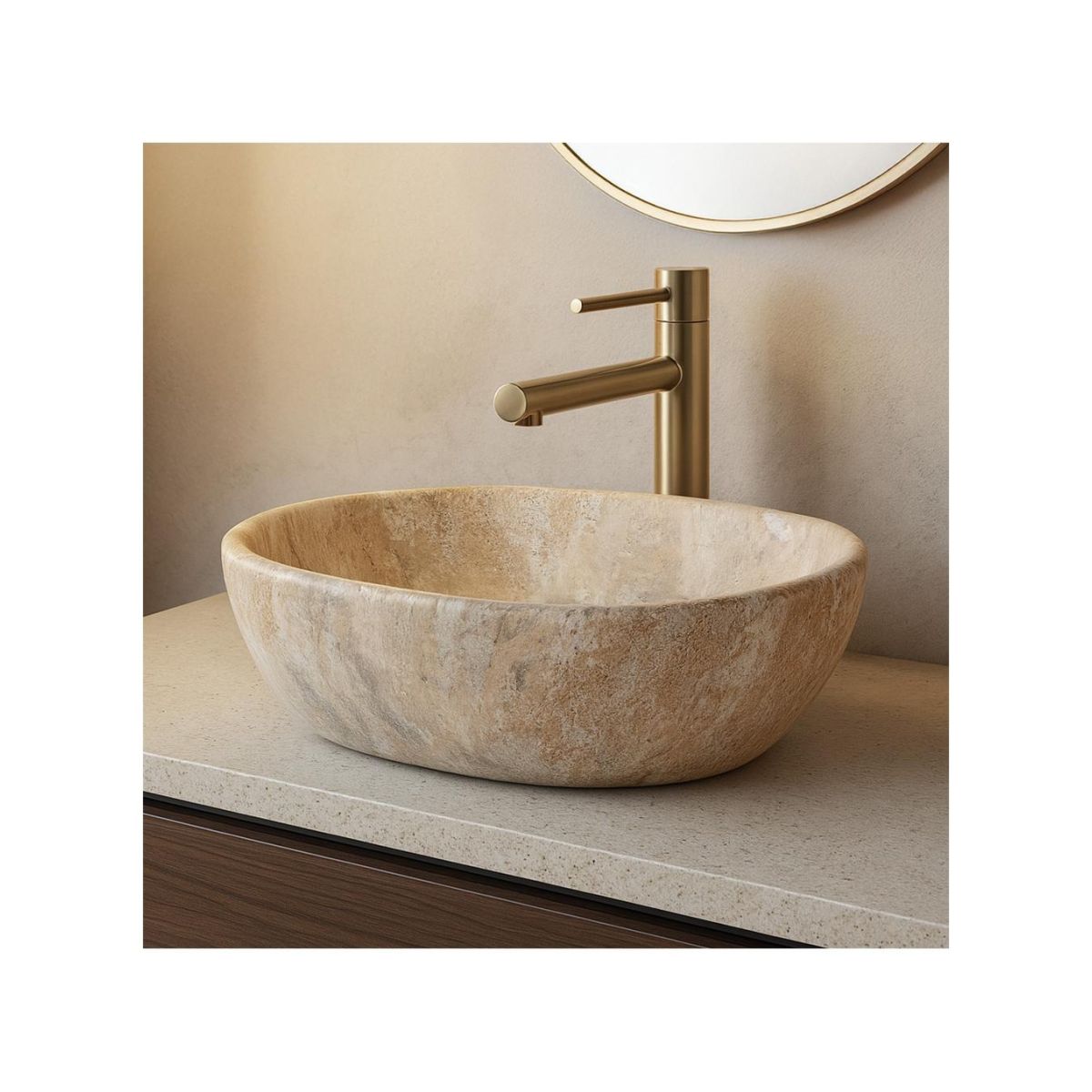 Das Aufsatzwaschbecken Amelia mit seiner einzigartigen, von Naturstein inspirierten Struktur ist eine perfekte Kombination aus Eleganz und schlichter Schönheit. Seine beige-sandfarbene Optik mit zarten Grautönen sorgt für eine organische Textur, die ideal zu Badezimmern im Natur-, Spa-, Japandi- oder Boho-Stil passt. Das Waschbecken ist aus hochwertiger Sanitärkeramik gefertigt und zeichnet sich durch Langlebigkeit und Widerstandsfähigkeit im täglichen Gebrauch aus. Das Modell kann sowohl auf einer Ablage als auch auf einem Schrank montiert werden, sodass es an individuelle Gestaltungswünsche angepasst werden kann. Da keine Öffnung für den Wasserhahn vorhanden ist, können Stand- oder Unterputzarmaturen verwendet werden, was Ihnen volle Gestaltungsfreiheit für den Waschbeckenbereich bietet. Dieses Waschbecken ist eine harmonische Verbindung von Natur, moderner Form und solider Verarbeitung.