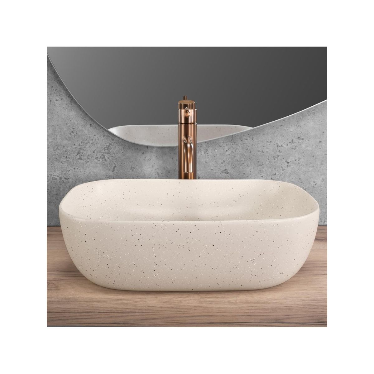 Das Aufsatzwaschbecken Belinda Sandy mit seiner einzigartigen, von Naturstein inspirierten Struktur ist eine perfekte Kombination aus Eleganz und schlichter Schönheit. Sein Design passt ideal zu Badezimmern im Natur-, Spa-, Japandi- oder Boho-Stil. Das aus hochwertiger Sanitärkeramik gefertigte Waschbecken zeichnet sich durch Langlebigkeit und Widerstandsfähigkeit im täglichen Gebrauch aus. Das Modell kann sowohl auf einer Ablage als auch auf einem Schrank montiert werden, wodurch es sich an individuelle Gestaltungswünsche anpassen lässt. Da es keine Öffnung für die Armatur gibt, können Stand- oder Unterputzarmaturen verwendet werden, was Ihnen volle Gestaltungsfreiheit für den Waschbeckenbereich lässt. Dieses Waschbecken ist eine harmonische Verbindung von Natur, moderner Form und solider Verarbeitung.