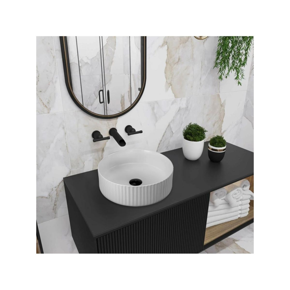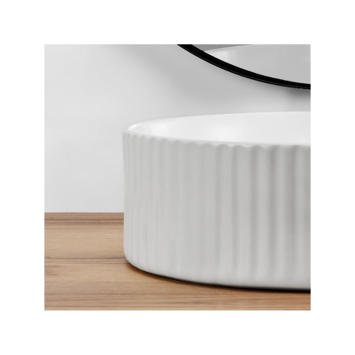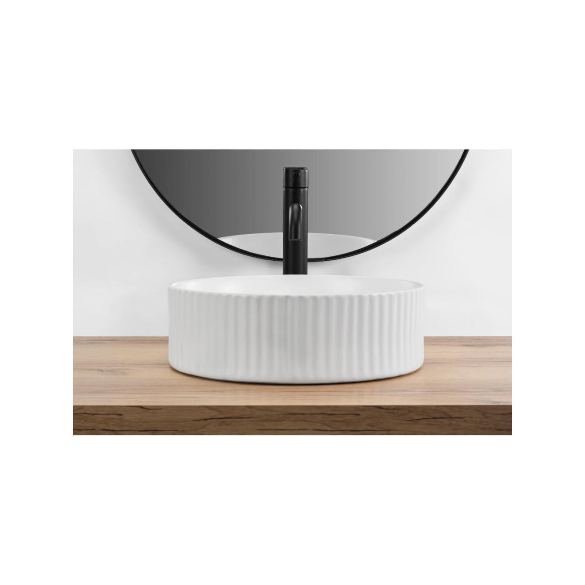 Wir präsentieren Ihnen ein Aufsatzwaschbecken, das Ihrem Badezimmer ein modernes Aussehen und hohe Funktionalität verleiht. Das Waschbecken ist aus hochwertiger Sanitärkeramik gefertigt. Die Außenfläche ist geriffelt, was einen interessanten visuellen Effekt erzeugt und dem Badezimmer einen einzigartigen Charakter verleiht.