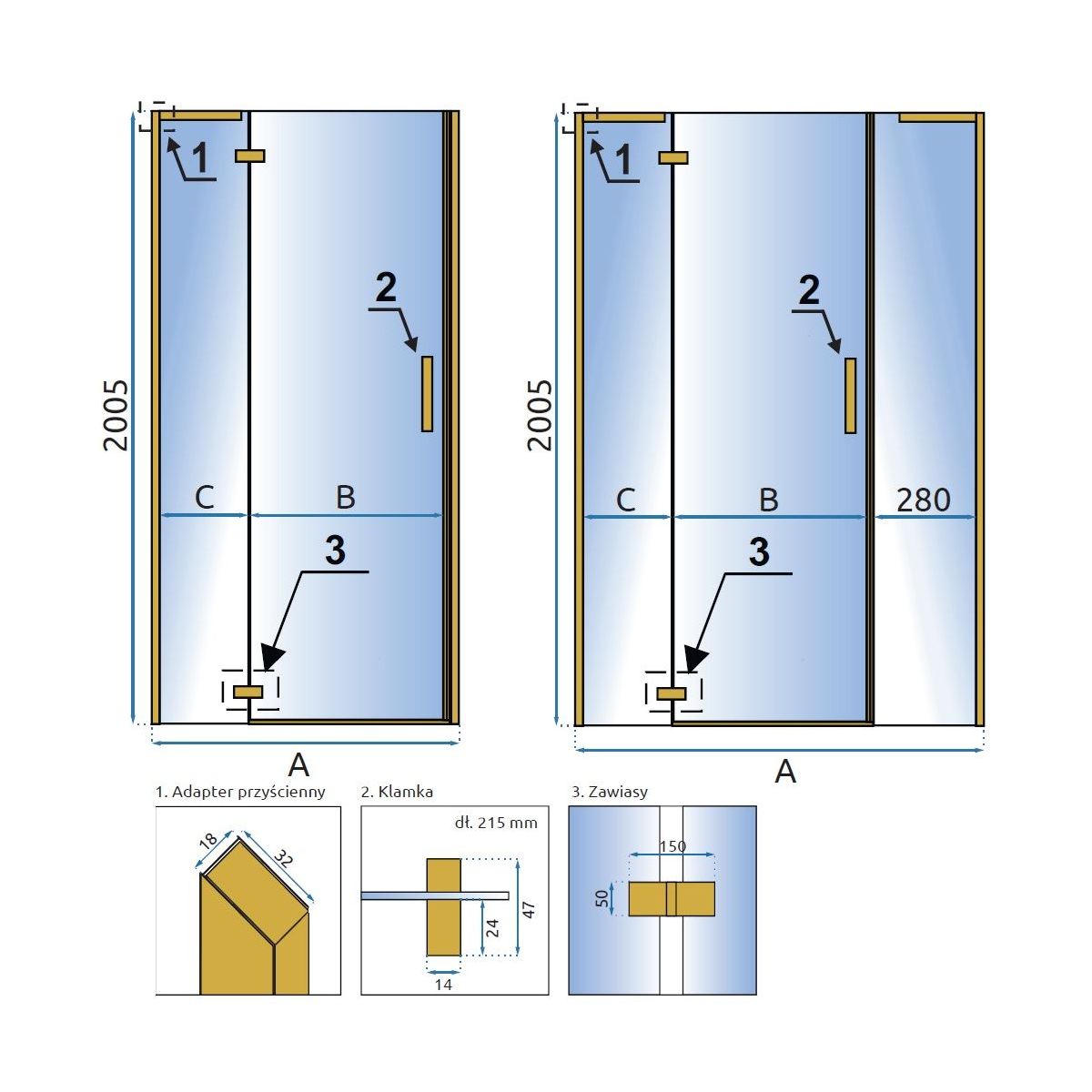 - Breite der festen Wand C: 21,5 cm