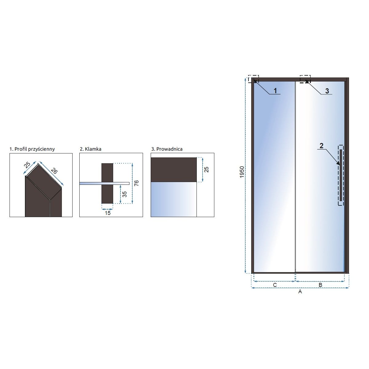 - Breite der festen Wand C: 43,5 cm
