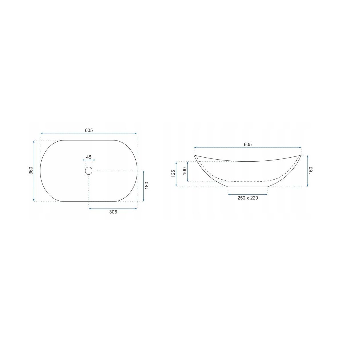 - Durchmesser des Abflusslochs: 45 mm