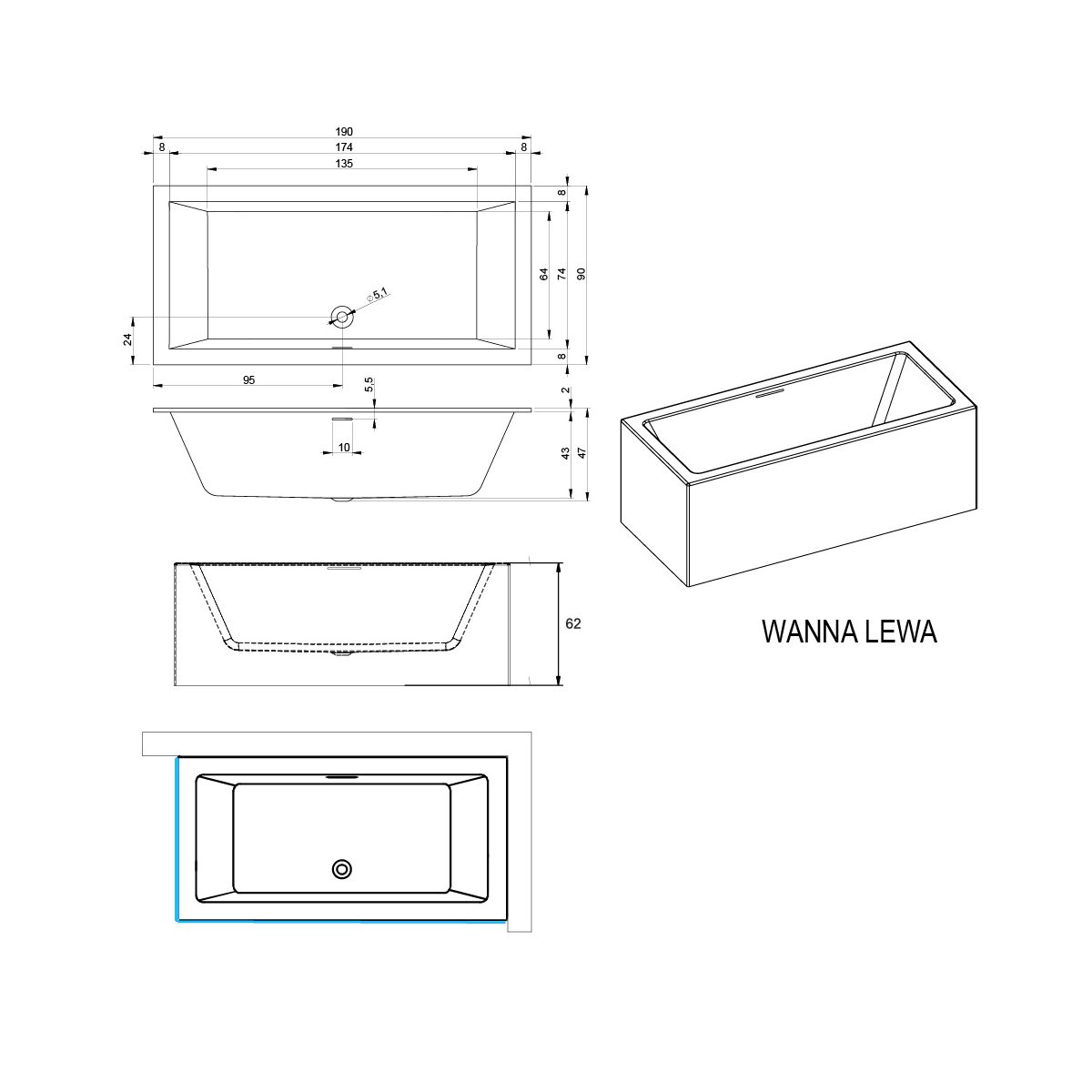 Die Plug&Play-Badewannenkollektion umfasst Badewannen, bei denen die lange und kurze Seite oder die Vorderseite (Eckversionen) der Badewanne mit Frontpaneelen aus dem gleichen Acrylmaterial wie die Badewanne ausgestattet sind. Sie bilden zusammen eine Einheit ohne sichtbare Verbindungsstellen. Diese Lösung ermöglicht eine viel schnellere Installation im Vergleich zu herkömmlichen Fliesenverkleidungen und garantiert eine ästhetische Einheitlichkeit. Die Höhe der Plug&Play-Badewanne beträgt 62 cm.