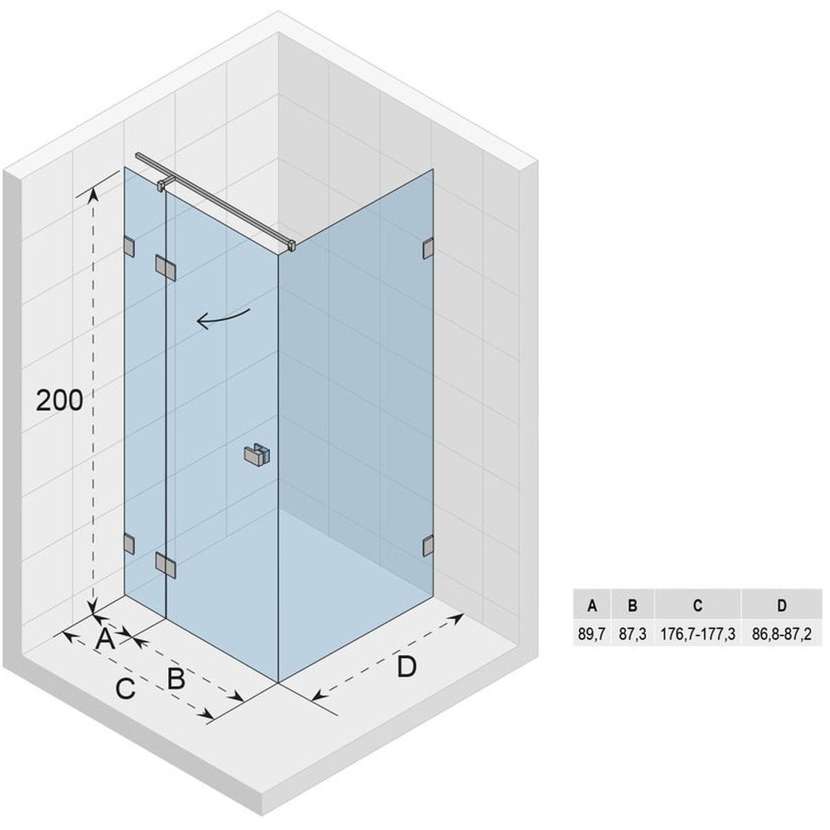 - Breite der festen Türwand (A): 89,7 cm