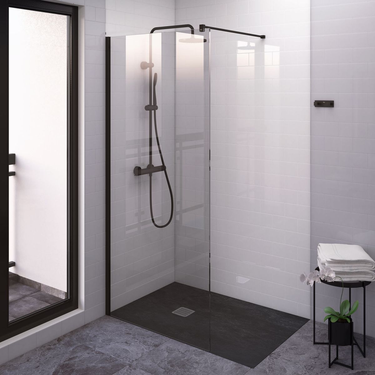 - Einzelwand Walk-In: Glasplatte AMP71(...) und Montageset DF in der gewünschten Farbe
