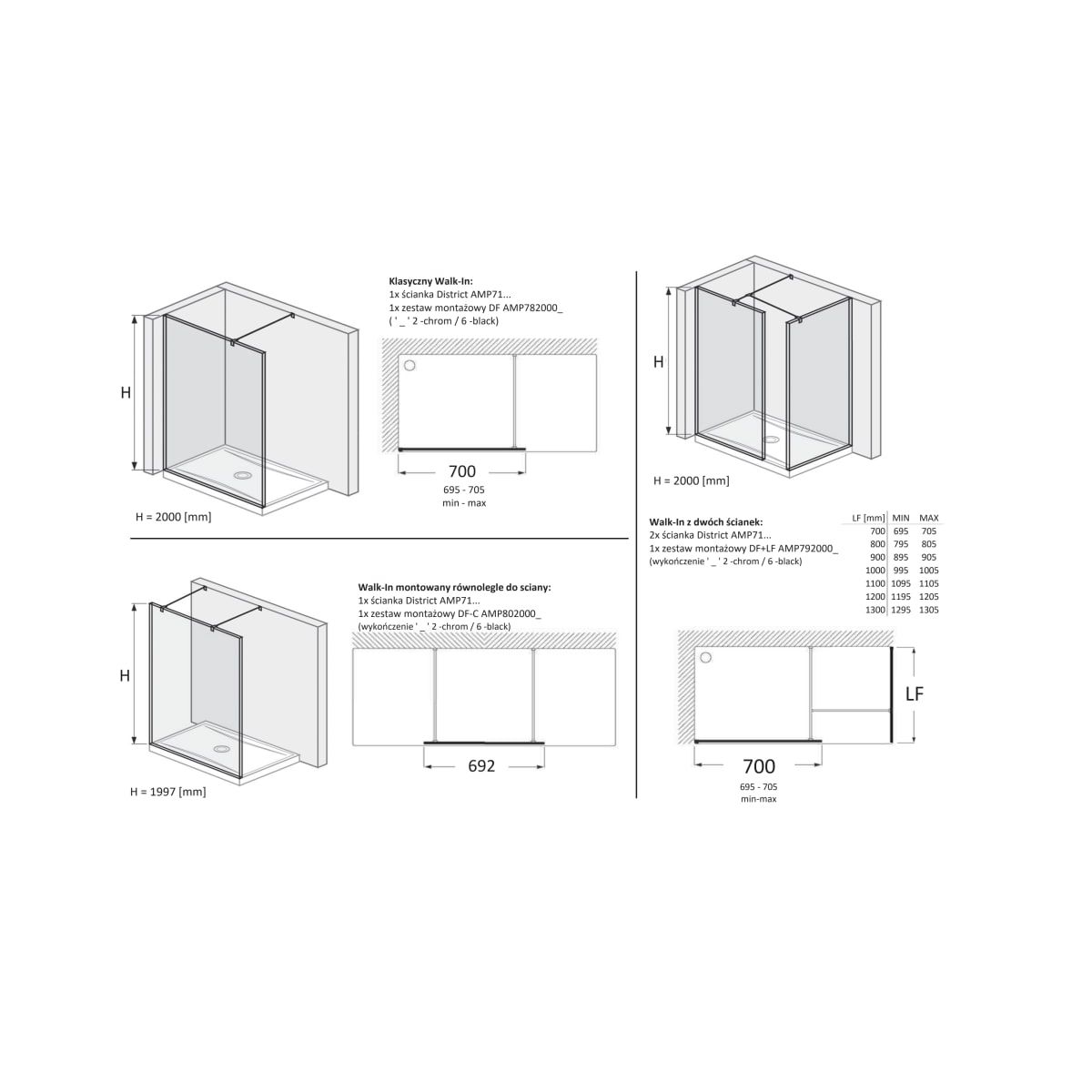 - zwei Walk-In-Wände: zwei Glasplatten AMP71(...) und Montageset DF+LF in der gewünschten Farbe