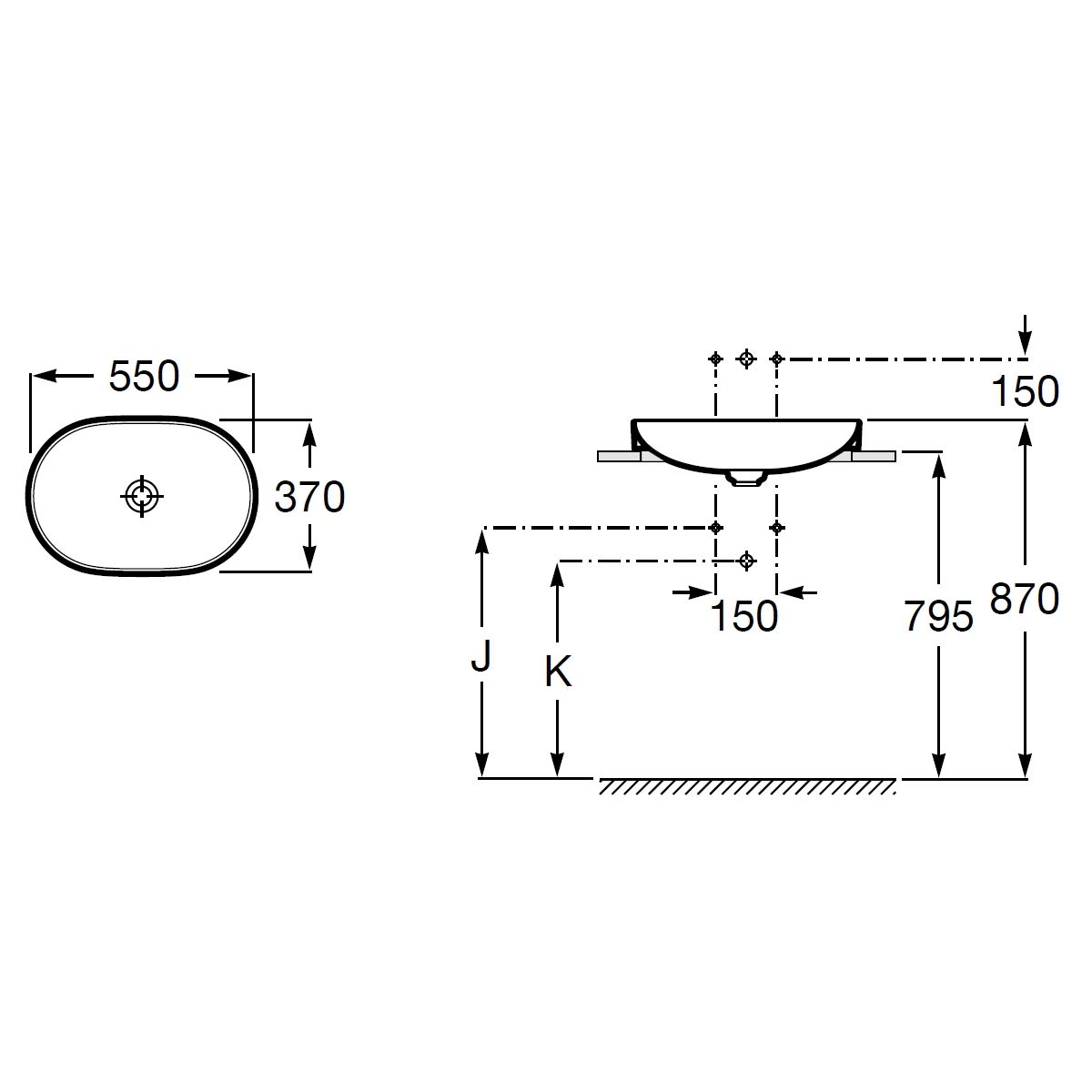- Waschbecken teilweise in die Arbeitsplatte eingelassen (Höhe über der Arbeitsplatte – 75 mm)
