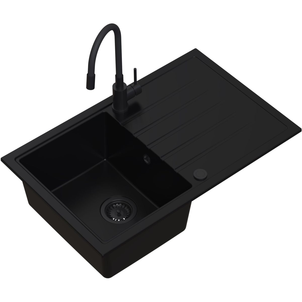 - Das moderne schwarze Set MAXI+ FULL BLACK ist ein markanter Akzent, der Eleganz mit maximaler Funktionalität verbindet. Die Spüle mit ihrer geräumigen, tiefen Kammer sorgt für hohen Komfort im täglichen Gebrauch und ermöglicht das bequeme Spülen von großem Geschirr, während die lange Abtropffläche zusätzlichen Arbeitsraum bietet und die Organisation der Arbeit an der Spüle erleichtert. Der automatische schwarze Siphon vom Typ „Save Space” ermöglicht eine effiziente Nutzung des Platzes im Schrank unter der Spüle, und der ästhetische Abflussregler unterstreicht das moderne, einheitliche Design des gesamten Sets.