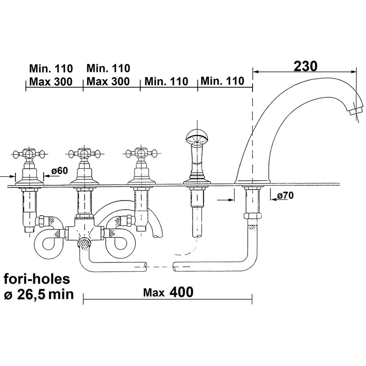 - Wasserhahn, Auslauf und Dusche können zusammen oder separat an einer beliebigen Stelle am Wannenrand montiert werden (flexible Verbindung mit Schläuchen)
