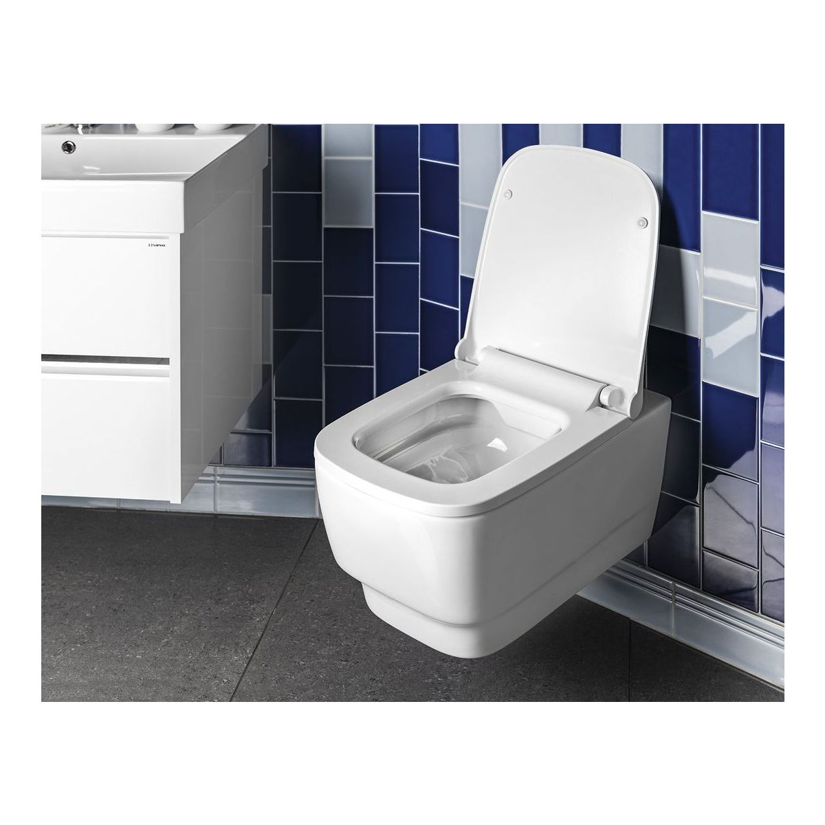 - Dank des Hydrauliksystems senken sich sowohl der Deckel als auch der Sitz langsam auf die Toilettenschüssel. Das langsame Senken des Sitzes und des Deckels sorgt für Sicherheit und verhindert Beschädigungen des Sitzes und der Schüssel