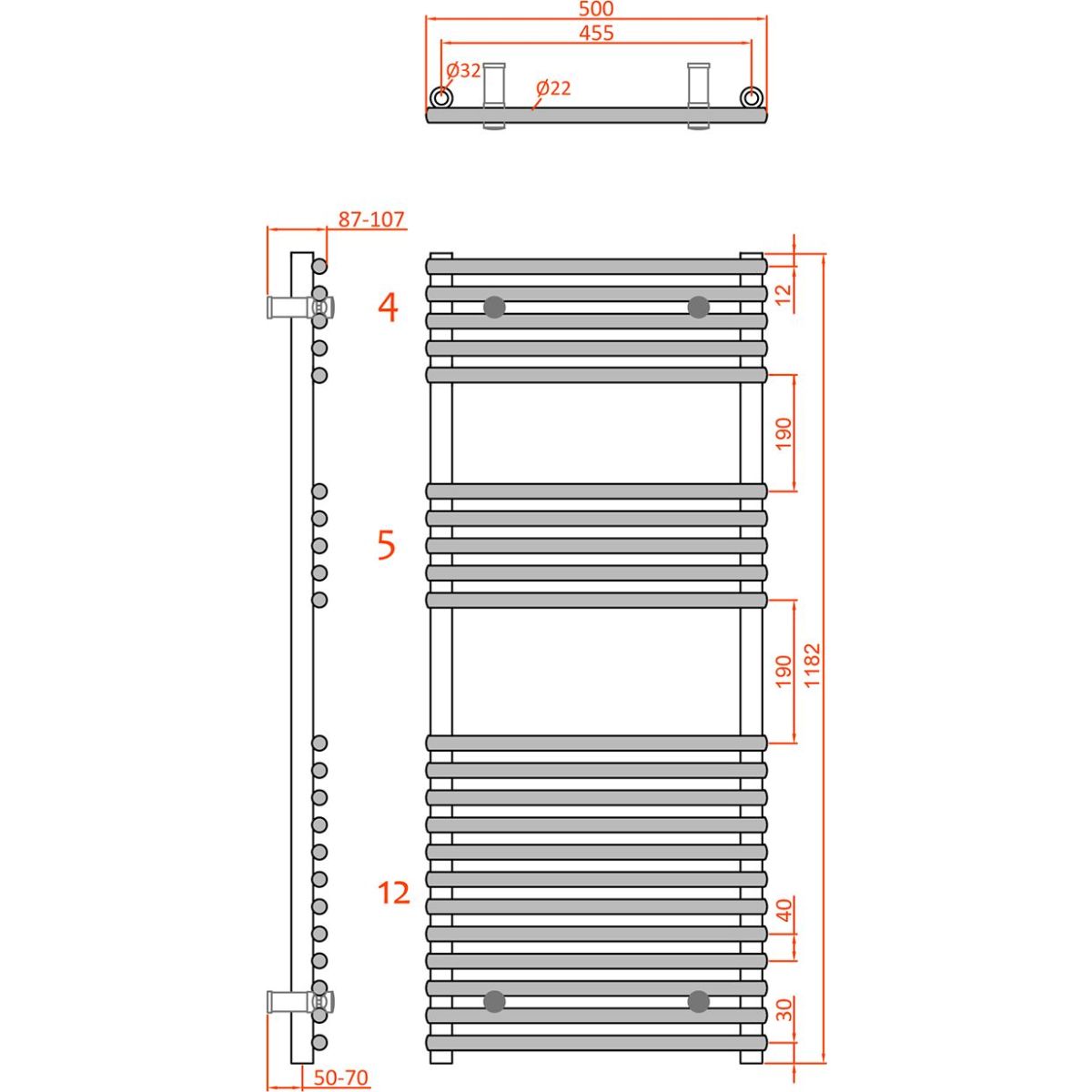 - Möglichkeit der Verwendung eines manuellen Ventils (kann unabhängig von der Warmwasserzufuhr auf der linken/rechten Seite installiert werden) oder eines Ventils mit Thermostatkopf