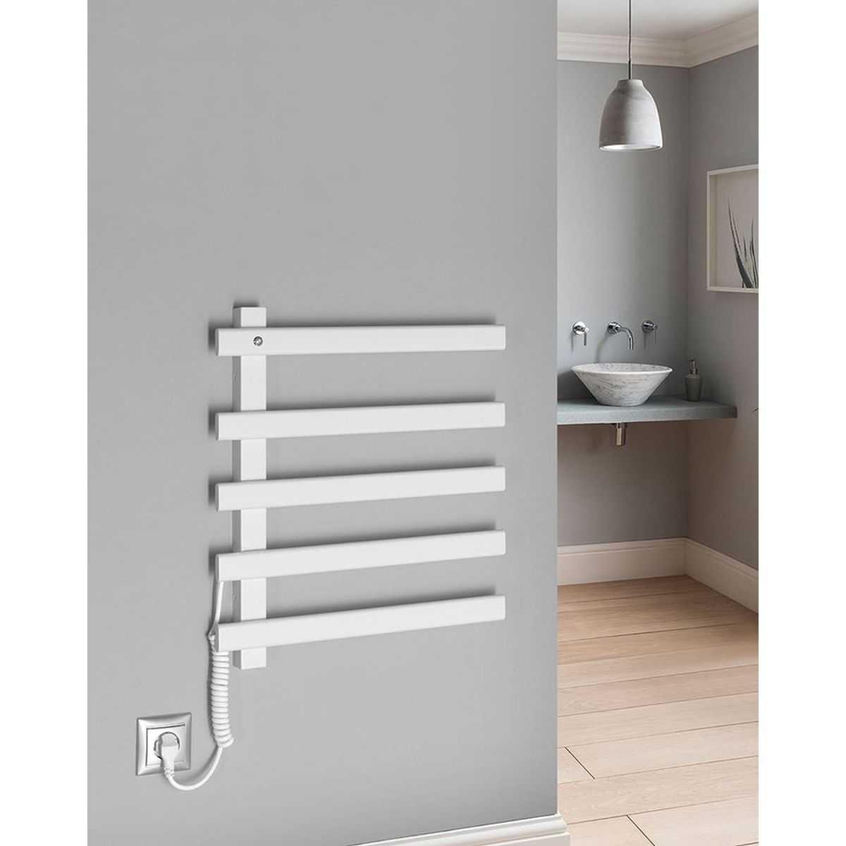 Die elektrischen Heizkörper aus lackiertem Edelstahl von ELCOR dienen zum Erwärmen und Trocknen von Handtüchern, was Sie besonders im Winter zu schätzen wissen werden. Die Heizung wird durch ein Widerstandskabel aus Kohlefaser (ohne Flüssigkeit) gewährleistet, der beleuchtete Schalter befindet sich oben links.