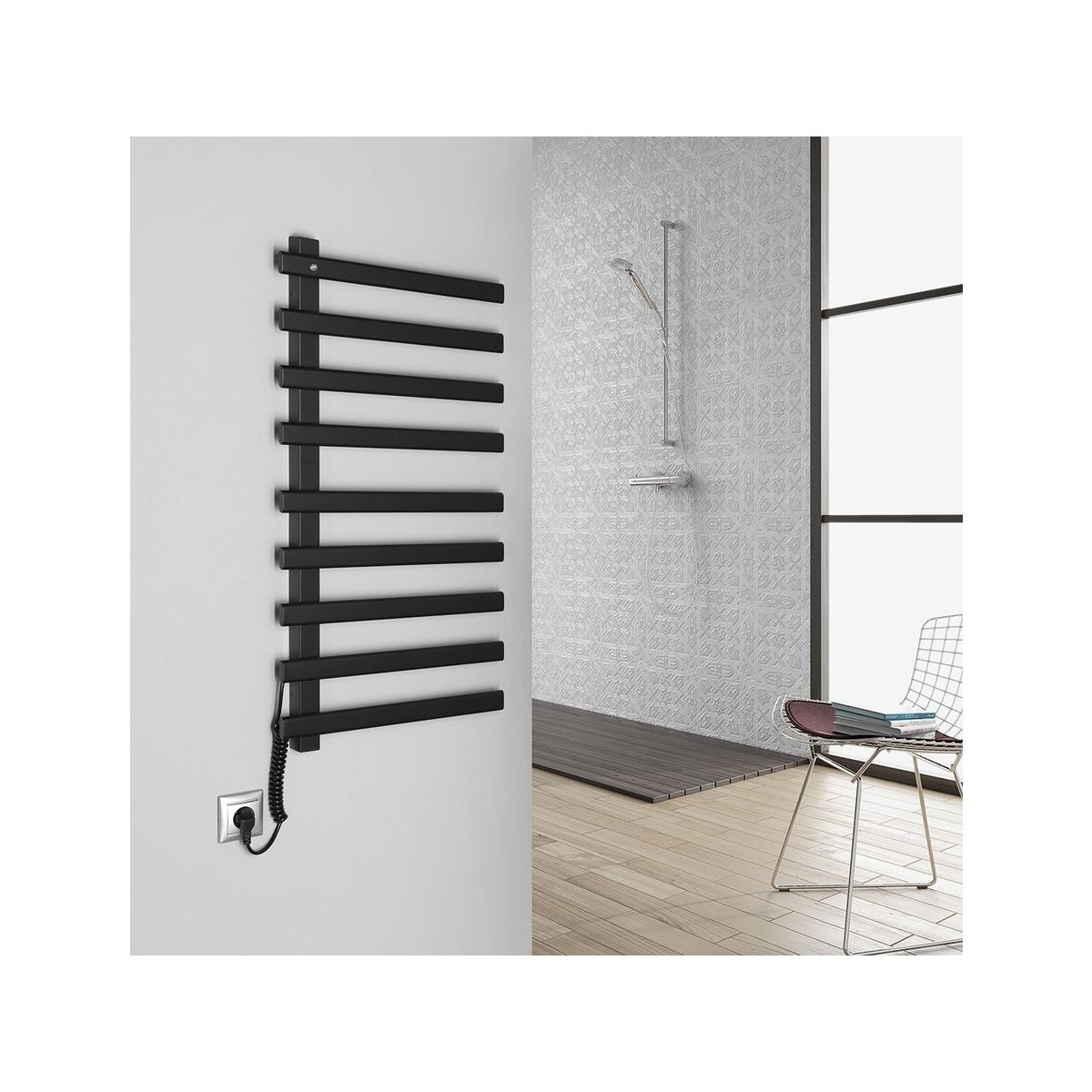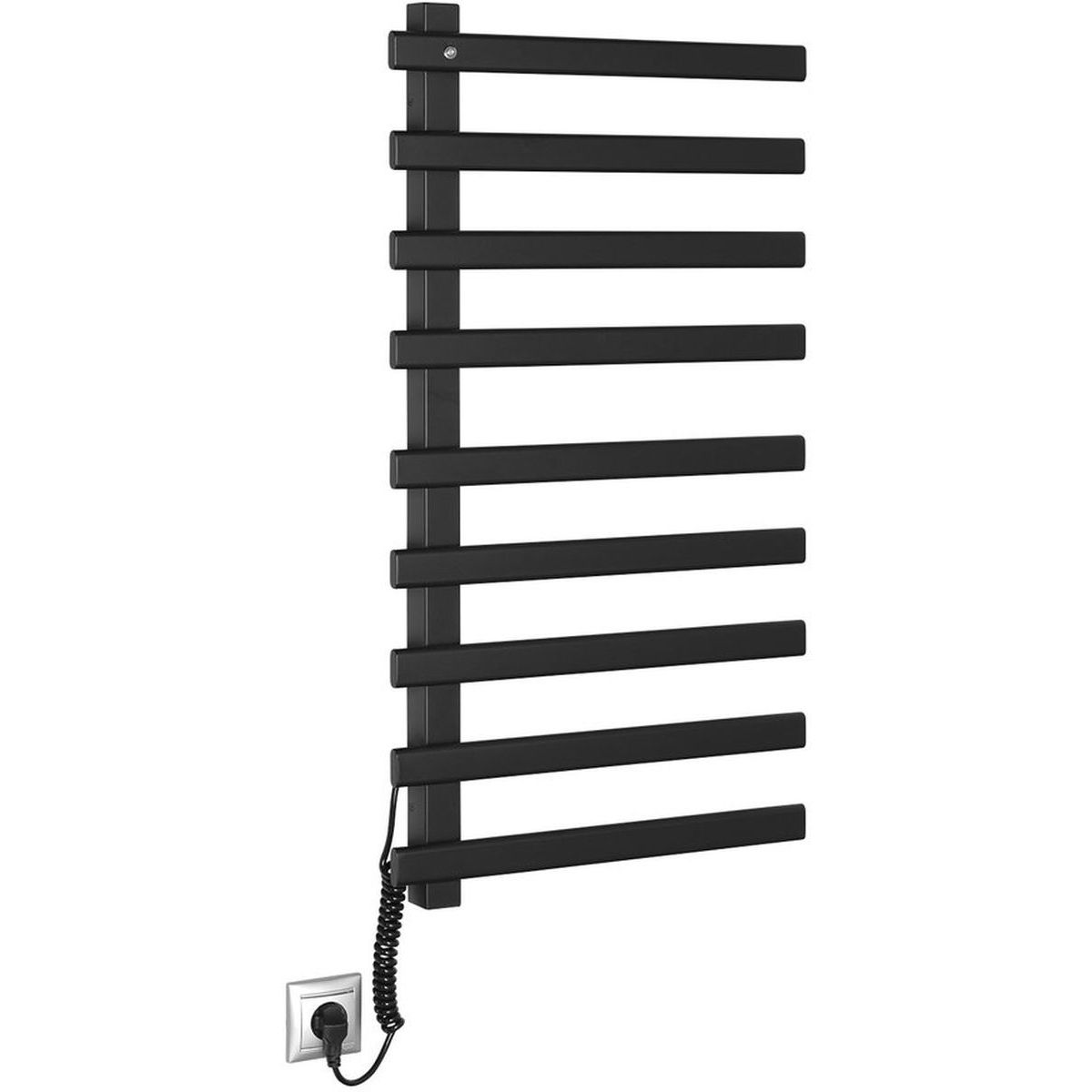 Die elektrischen Heizkörper aus lackiertem Edelstahl von Elcor dienen zum Erwärmen und Trocknen von Handtüchern, was Sie besonders im Winter zu schätzen wissen werden. Die Heizung erfolgt über ein Widerstandskabel aus Kohlefaser (ohne Flüssigkeit), der beleuchtete Schalter befindet sich oben links.