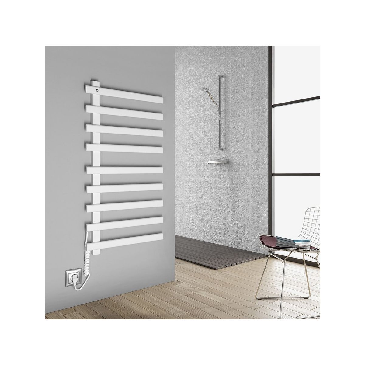 Die elektrischen Heizkörper aus lackiertem Edelstahl von Elcor dienen zum Erwärmen und Trocknen von Handtüchern, was Sie besonders im Winter zu schätzen wissen werden. Die Heizung erfolgt über ein Widerstandskabel aus Kohlefaser (ohne Flüssigkeit), der beleuchtete Schalter befindet sich oben links.
