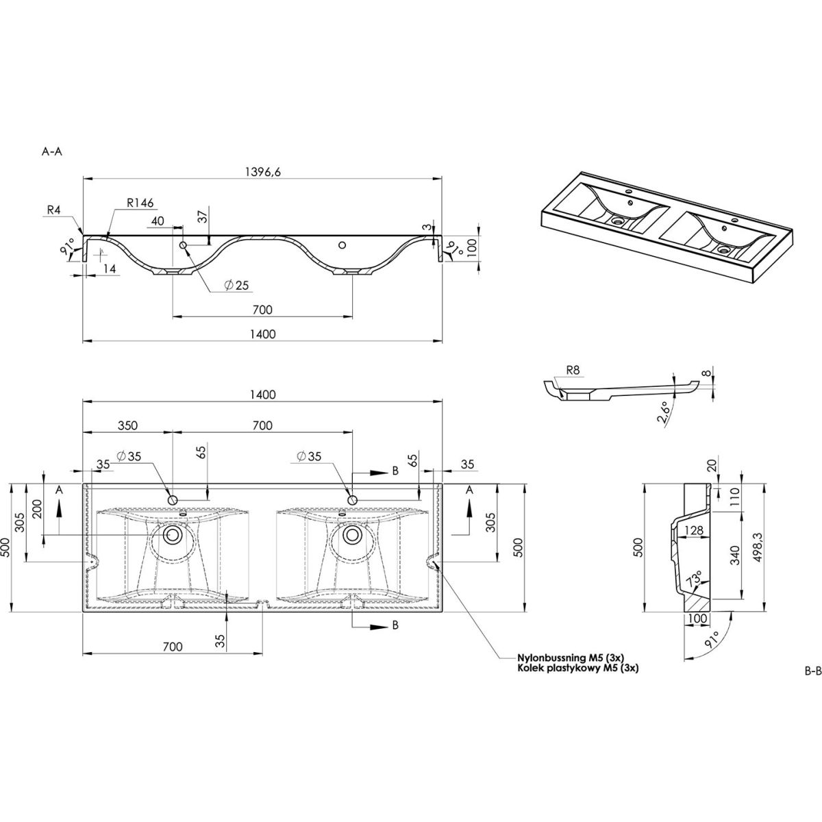 Sapho Flavia Waschbecken 140x50 cm rechteckig Klassisch-Doppelt weiß 68141