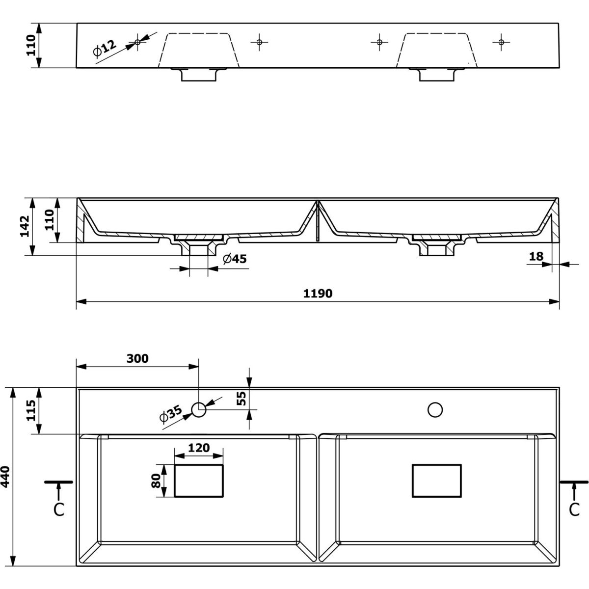 Sapho Godiva Waschbecken 119x44 cm rechteckig Klassisch-Möbel-Doppelt weiß GU119