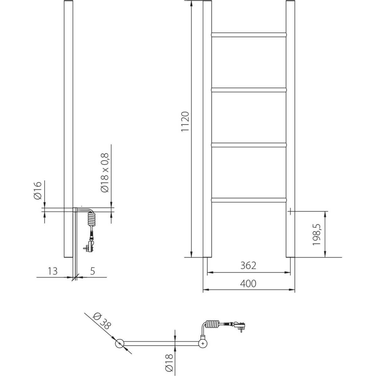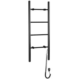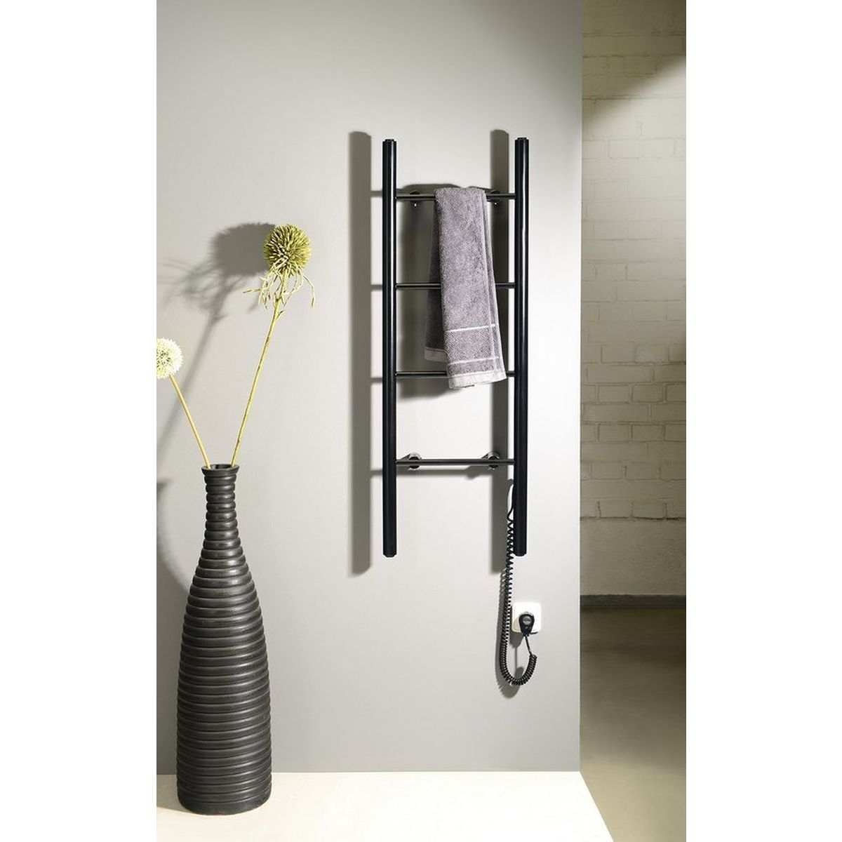 Elektrischer Handtuchtrockner für moderne Innenräume – nicht nur die Rohre, sondern auch das Netzkabel und der Stecker sind in mattem Schwarz gehalten. Dank seiner Tiefe von 10 cm nimmt er nicht viel Platz im Badezimmer ein. Er kann als Hängetrockner an der Wand montiert oder an die Wand gelehnt und nur mit den oberen Halterungen befestigt werden. Die Heizung des Trockners wird durch einen Widerstandsdraht gewährleistet, sodass er nicht mit Flüssigkeit für Heizkörper befüllt werden muss. Am unteren Ende des vertikalen Rohrs befindet sich ein Kippschalter.