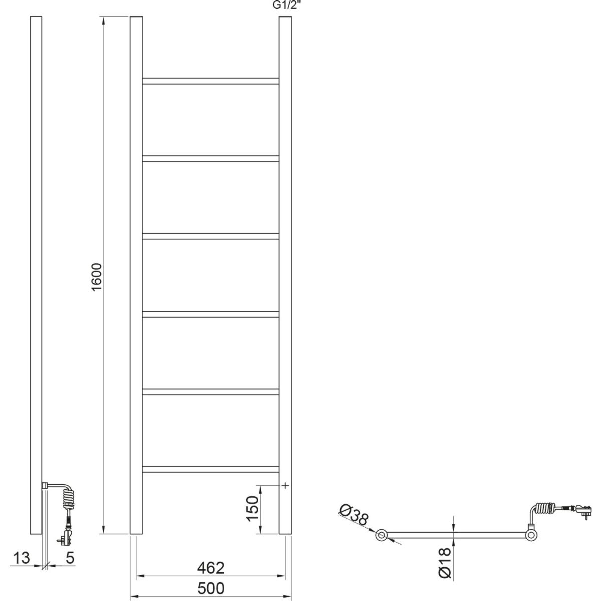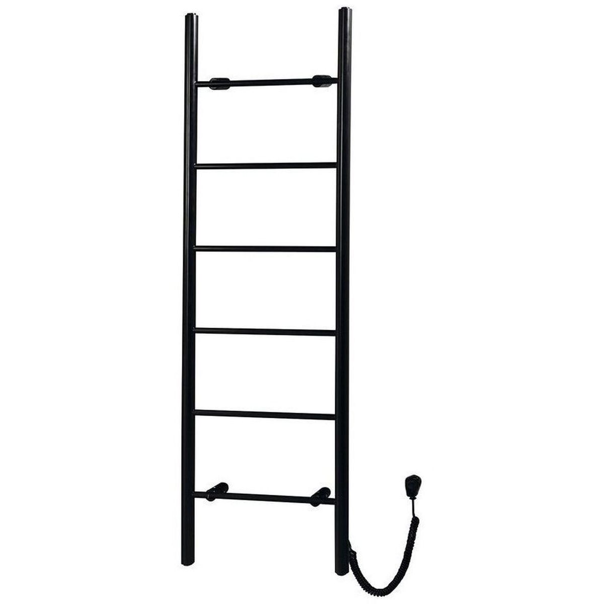 Elektrischer Handtuchtrockner für moderne Innenräume – nicht nur die Rohre, sondern auch das Netzkabel und der Stecker sind in mattem Schwarz gehalten. Dank seiner Tiefe von 10 cm nimmt er nicht viel Platz im Badezimmer ein. Er kann als Wandtrockner an der Wand montiert oder an die Wand gelehnt und nur mit den oberen Halterungen befestigt werden. Die Heizung des Trockners wird durch einen Widerstandsdraht gewährleistet, sodass er nicht mit Heizflüssigkeit befüllt werden muss. Am unteren Ende des vertikalen Rohrs befindet sich ein Kippschalter.