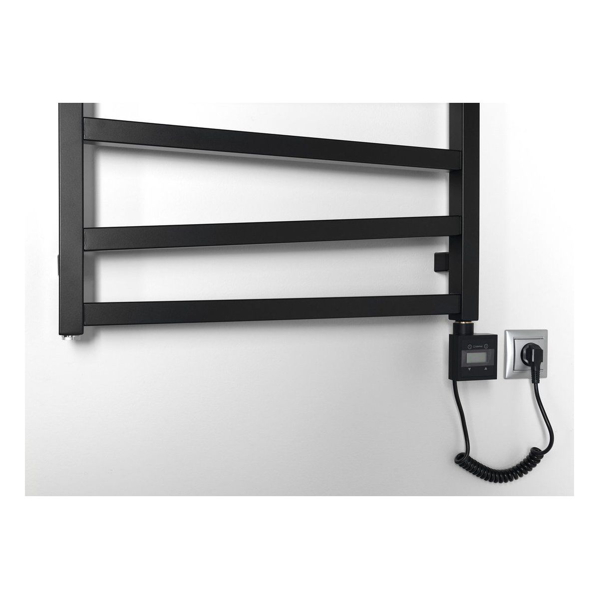 KTX BLACK – elektrischer Heizkörper mit Thermostat, LCD-Display und Folientastatur. Quadratische Bauweise, geeignet für alle Heizkörpertypen. Die symmetrische Bauweise ermöglicht die Montage auf der linken und rechten Seite des Heizkörpers.