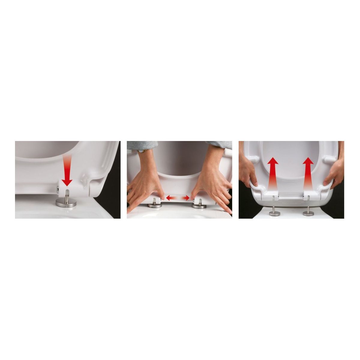 - Der Toilettensitz mit „Soft Close”-System garantiert ein langsames Herunterklappen, während die Systeme „Easy Take” und „Quick Release” ein einfaches Abnehmen und Aufsetzen des Sitzes ermöglichen