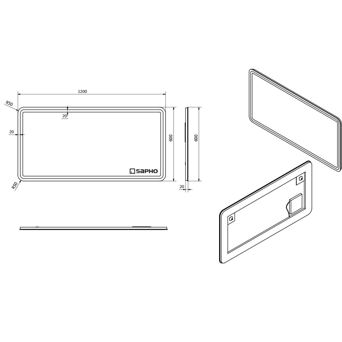 Sapho Nyx Spiegel 120x60 cm rechteckig mit Beleuchtung NY120
