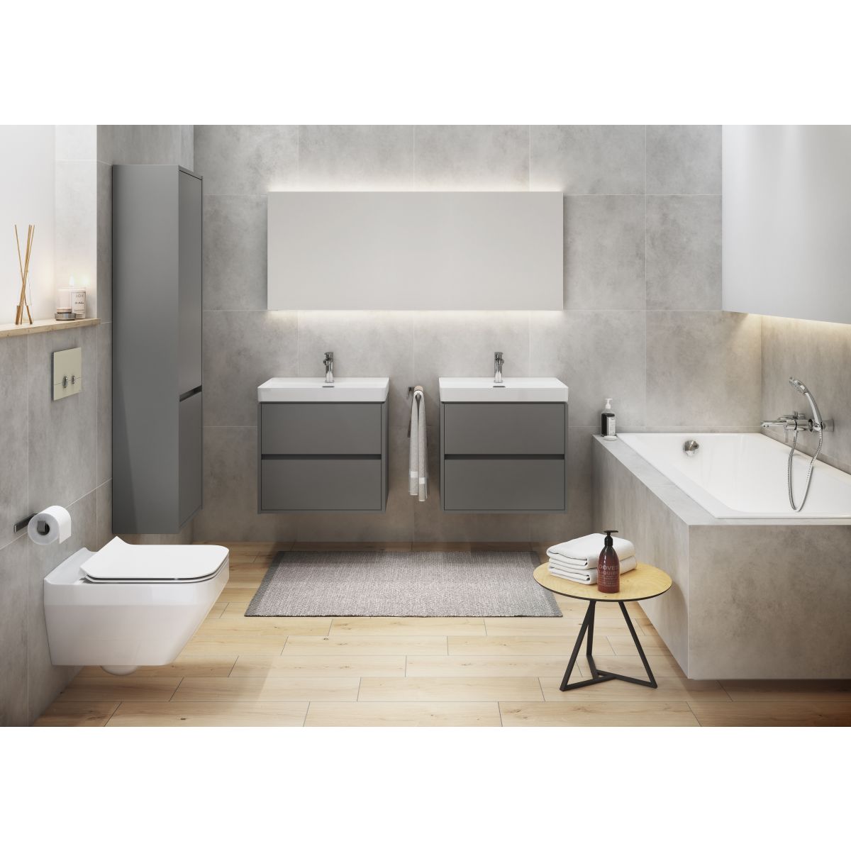 Das Set besteht aus einem hängenden Waschtischunterschrank CREA 100 mit einem Waschbecken CREA 100. Die Front und der Korpus des Schranks sind aus feuchtigkeitsbeständiger Spanplatte in Weiß gefertigt. Der Schrank ist mit einem Touch-Öffnungssystem (sog. PUSH SYSTEM) und zwei geräumigen Schubladen ausgestattet. Das Innere mit einer grauen Leinenstruktur verleiht dem Schrank ein besonders elegantes Aussehen. Das Waschbecken CREA ist aus ROCKLITE-Keramik gefertigt, wodurch es erstaunlich widerstandsfähig, leicht und mit extrem dünnen Wänden ist.
