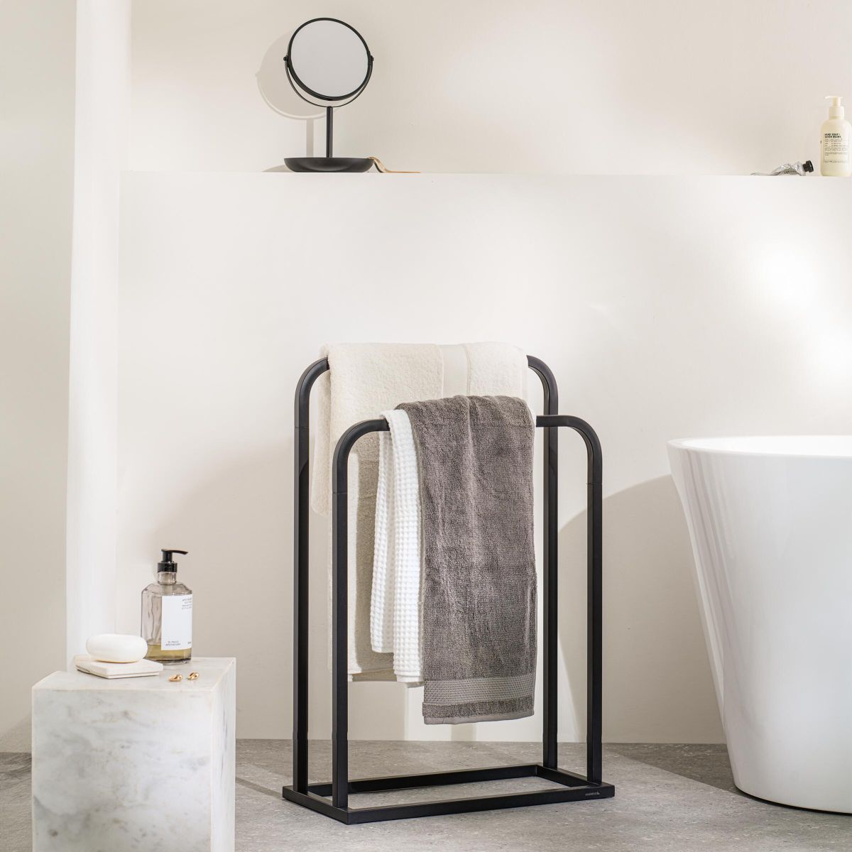 Verleihen Sie Ihrem Badezimmer mit diesem trendigen, freistehenden Handtuchhalter mehr Funktionalität und Stil. Die schwarze Oberfläche verleiht dem Raum einen kühnen, industriellen Charakter und passt perfekt zu den aktuellen Einrichtungstrends. Die durchdachte Konstruktion ermöglicht eine einfache Installation an jedem beliebigen Ort und sorgt für bequemen Zugang zu trockenen Handtüchern.