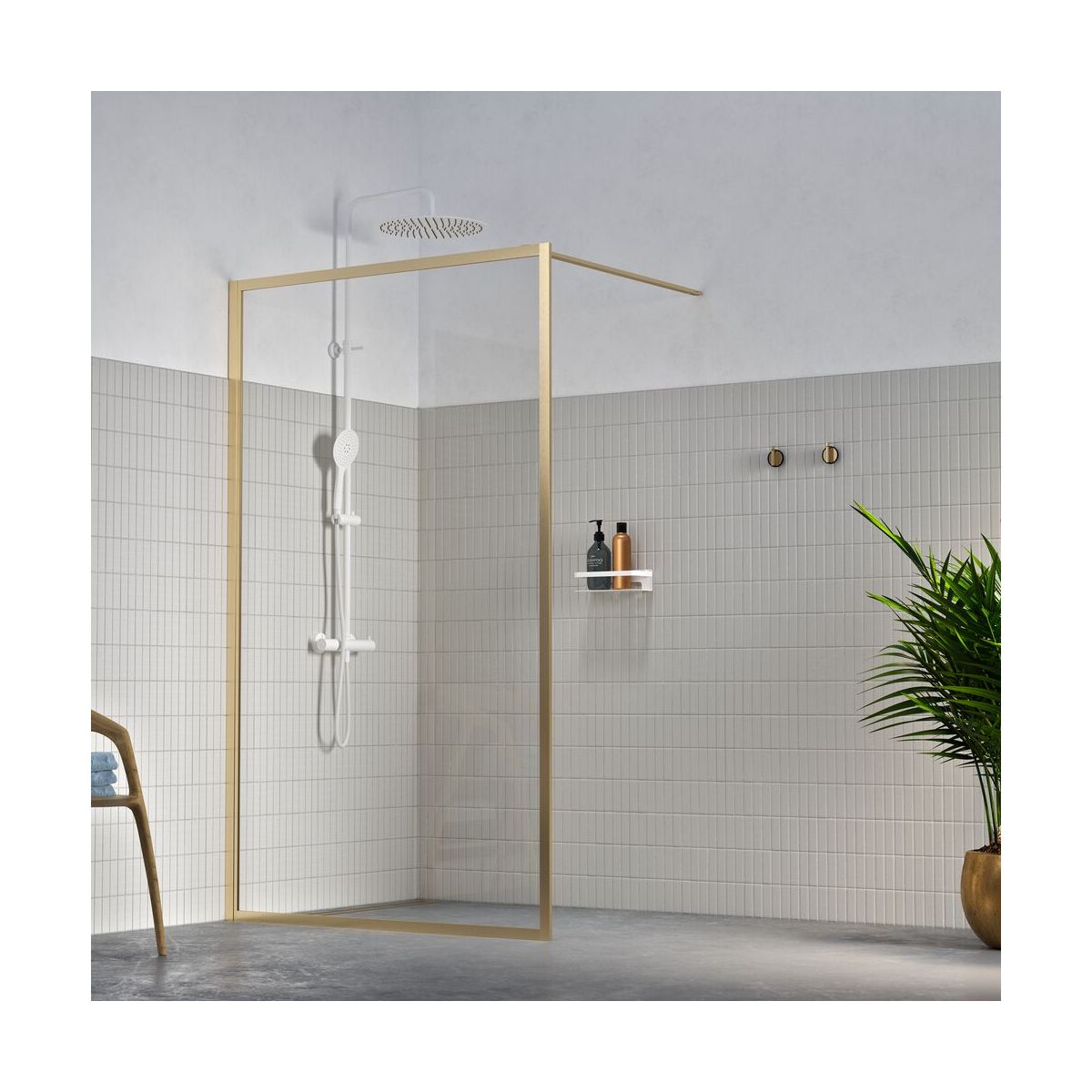Mit ihrem Rahmen in gebürstetem Gold ist diese begehbare Dusche aus der Contour-Serie ideal für die Modernisierung Ihres Badezimmers. Die Details sind subtil, aber dennoch unübersehbar. Dank ihres minimalistischen Designs wirkt diese begehbare Dusche sehr geräumig. Ideal für kleinere Badezimmer. Das 6 mm starke Sicherheitsglas ist zusätzlich mit einer Anti-Kalk-Beschichtung versehen, sodass Ihre Dusche länger kristallklar bleibt. Die 1 Meter lange Stabilisierungsstange kann auf jede beliebige Länge gekürzt und sogar in einem Winkel montiert werden. So passt die Contour-Dusche fast immer.