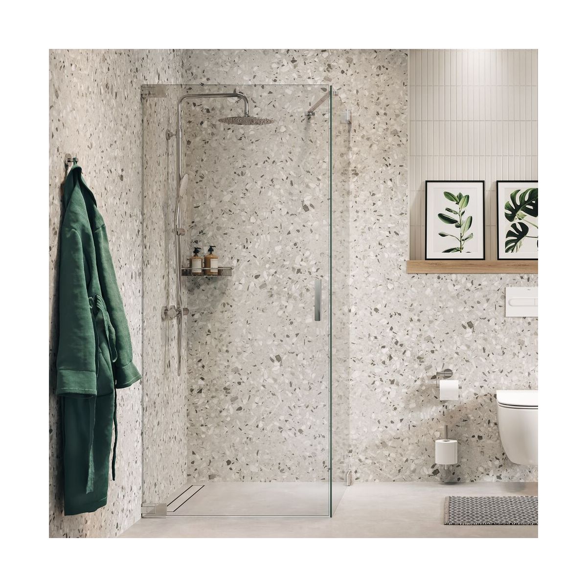 Erleben Sie eine einzigartige Kombination aus Stil und Funktionalität mit unseren Flügeltüren und Seitenwänden aus derselben Serie. Die Kabine ist 88 cm breit und passt somit in die meisten 90 cm breiten Duschwannen oder kann direkt auf den gefliesten Boden gestellt werden. Hochwertige Edelstahlbefestigungen sorgen für eine flache Verbindung mit 8 mm starkem Sicherheitsglas, das mit einer Anti-Kalk-Beschichtung versehen ist. So bleibt das Glas sauber und lässt sich nach dem Baden leichter abtrocknen. Wer würde das nicht wollen? Die Flügeltüren lassen sich nach innen oder außen öffnen und sind mit einem automatischen Schließsystem ausgestattet, das das Schließen erleichtert. Die Scharniere und der Türgriff sind in silbernem Glanz gehalten. Ein zeitloses Finish, das gut in ein modernes Badezimmer passt.