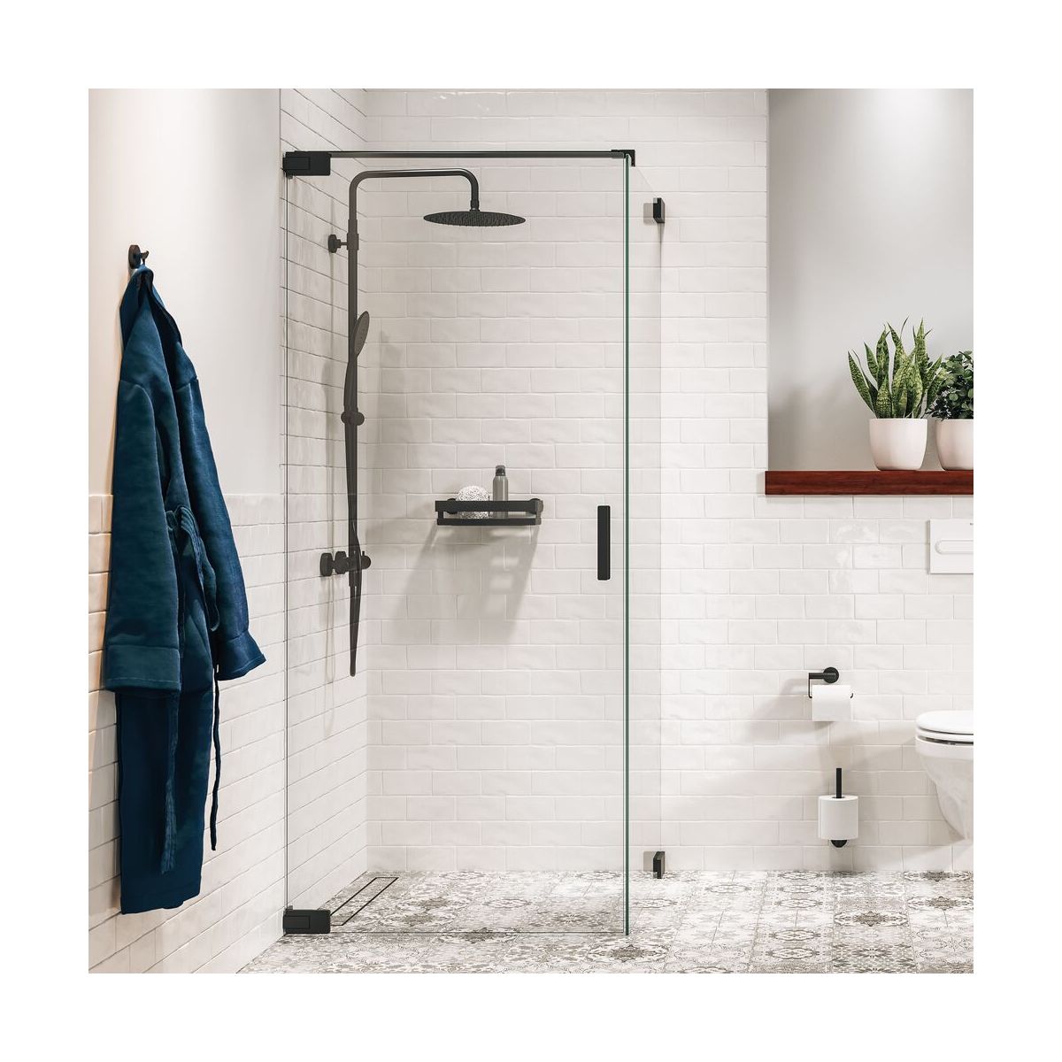 Erleben Sie eine einzigartige Kombination aus Stil und Funktionalität mit unseren Flügeltüren und Seitenwänden aus derselben Serie. Die Kabine ist 88 cm breit und passt somit in die meisten 90 cm breiten Duschwannen oder kann direkt auf den gefliesten Boden gestellt werden. Hochwertige Edelstahlbefestigungen sorgen für eine flache Verbindung mit 8 mm starkem Sicherheitsglas, das mit einer Anti-Kalk-Beschichtung versehen ist. So bleibt das Glas sauber und lässt sich nach dem Baden leichter abtrocknen. Wer würde das nicht wollen? Die Flügeltüren lassen sich nach innen oder außen öffnen und sind mit einem automatischen Schließsystem ausgestattet, das das Schließen erleichtert. Die Scharniere und der Griff sind in mattem Schwarz gehalten. Ein mutiges Finish, das gut zu vielen Badezimmerstilen passt.