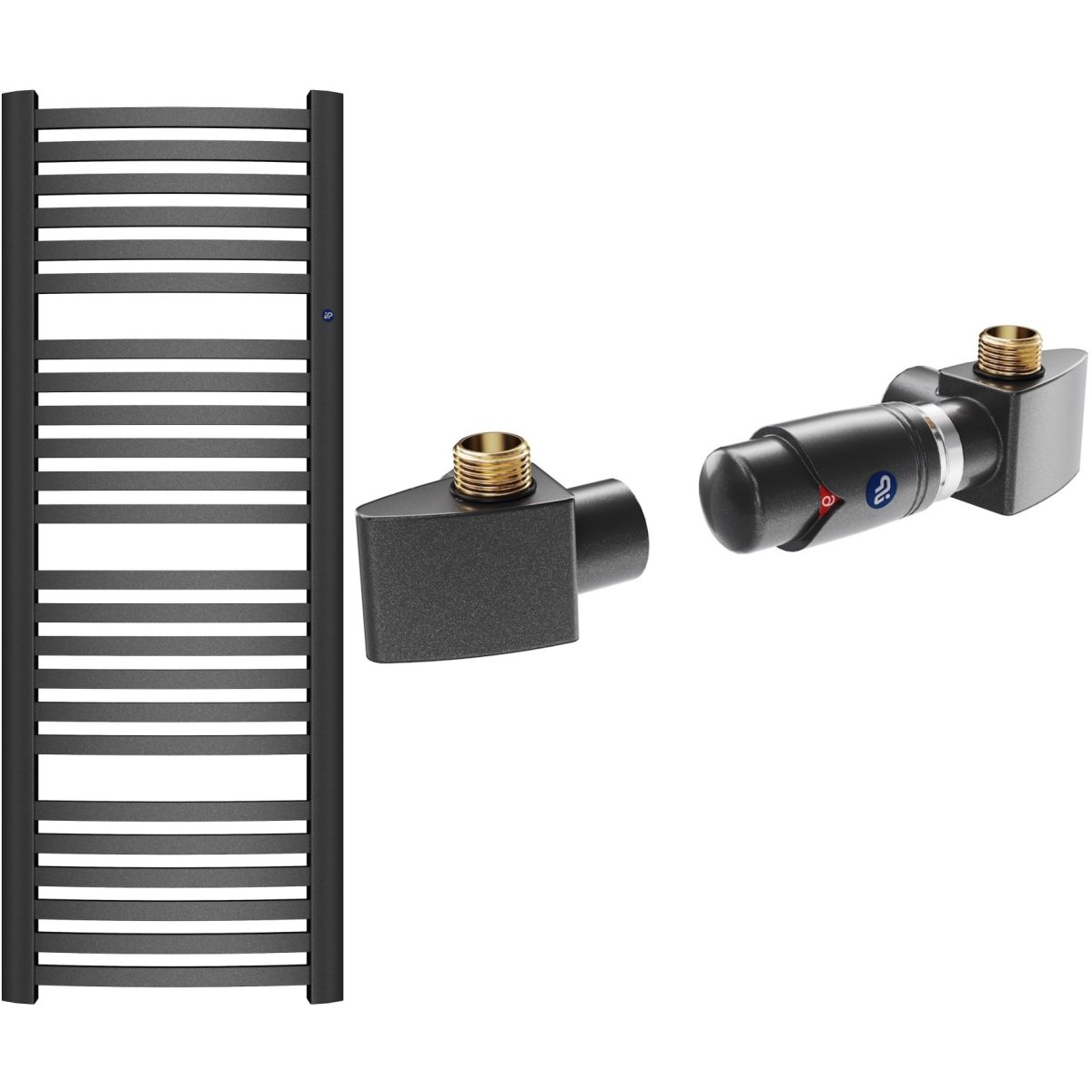 Spezielle Ventilgarnitur für RETTO-Heizkörper von Instal Projekt, geeignet für den Einbau in Anlagen mit Unterversorgung. Für die Versorgung im linken Verteiler ist das rechte Ventil zu montieren, für die Versorgung im rechten Verteiler das linke Ventil. Der elektrische Heizkörper ist im Rücklaufkollektor der Anlage zu montieren. Das Set ermöglicht eine präzise Temperaturregelung und einen zuverlässigen Betrieb bei hohen Temperaturen und hohem Druck.