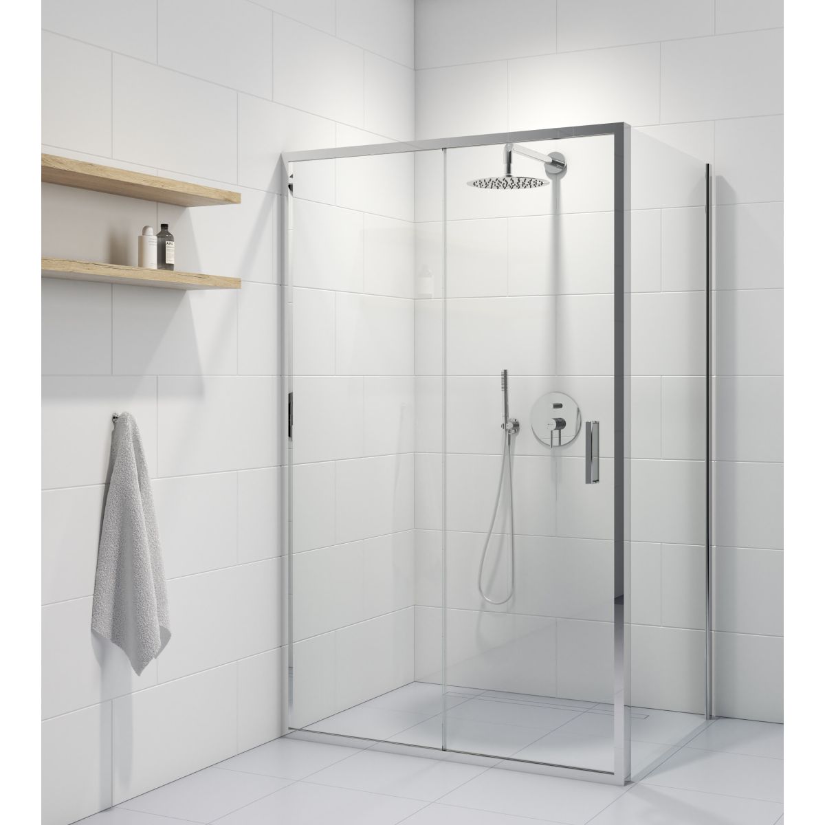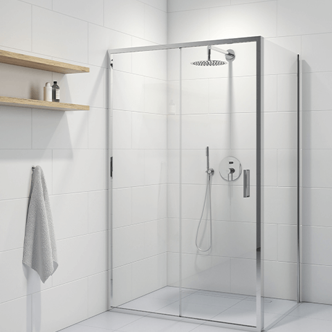 Rechteckige Duschkabine mit Schiebetüren, 6 mm Klarglas mit beidseitig im Produktionsprozess eingesetzter Oltens SmartClean‑Beschichtung.