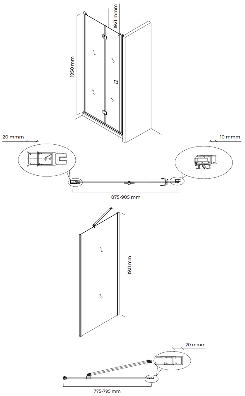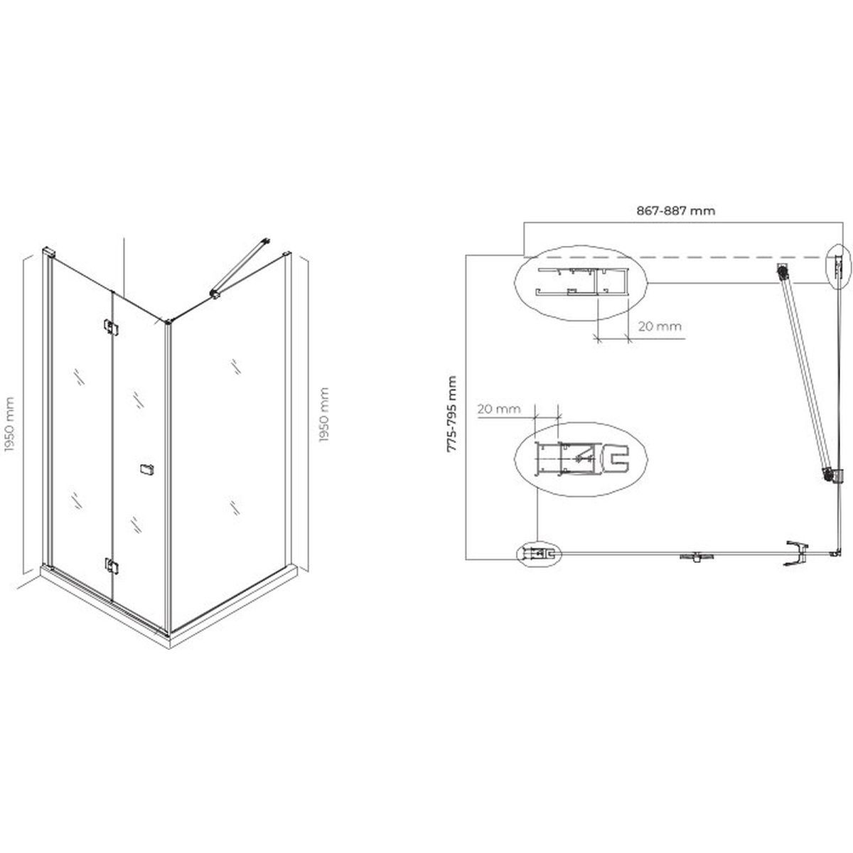 Montage der Kabine ist universell, d. h. sie kann sowohl auf der linken als auch auf der rechten Seite montiert werden verchromte Metallscharniere.